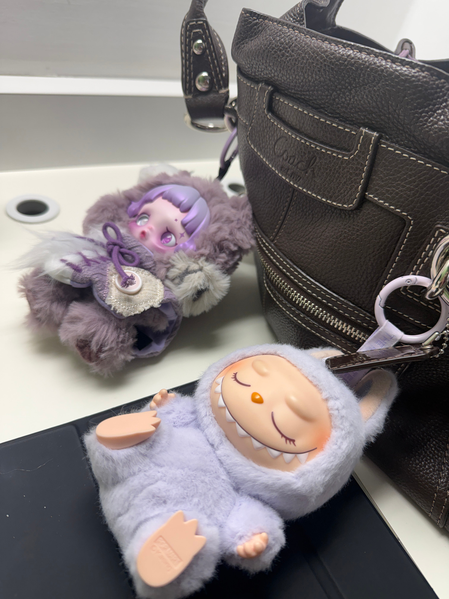A close-up shot shows a brown Coach purse, oriented diagonally, with two plush toys attached to it. One is a furry, purple doll-like figure with a pale face, purple hair, and a buttoned cloak. The oth…read more