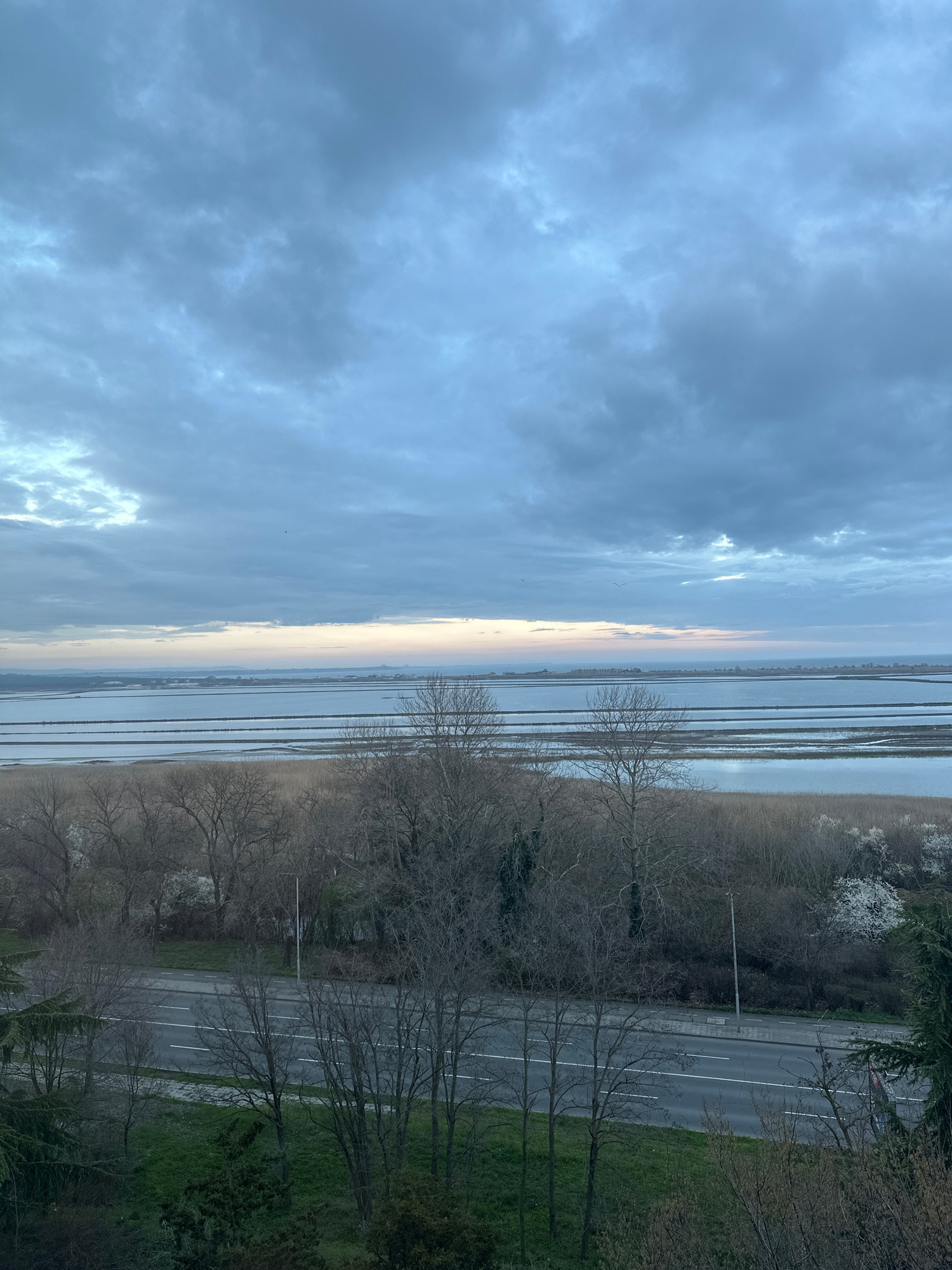 The image is a landscape view with the horizon line running vertically in the center. To the left, the sky is filled with gray clouds. A narrow strip in the center displays a body of water reflecting…read more