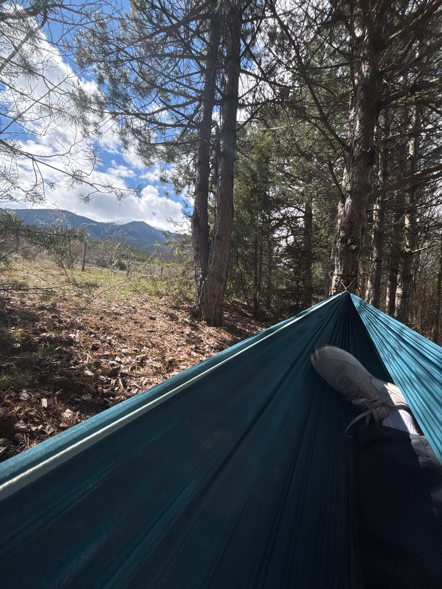 The image shows a person lying in a blue hammock in a forest, presumably in the vicinity of Bansko, Bulgaria, given the mention of the location. One foot wearing a gray sneaker is visible resting on t…read more