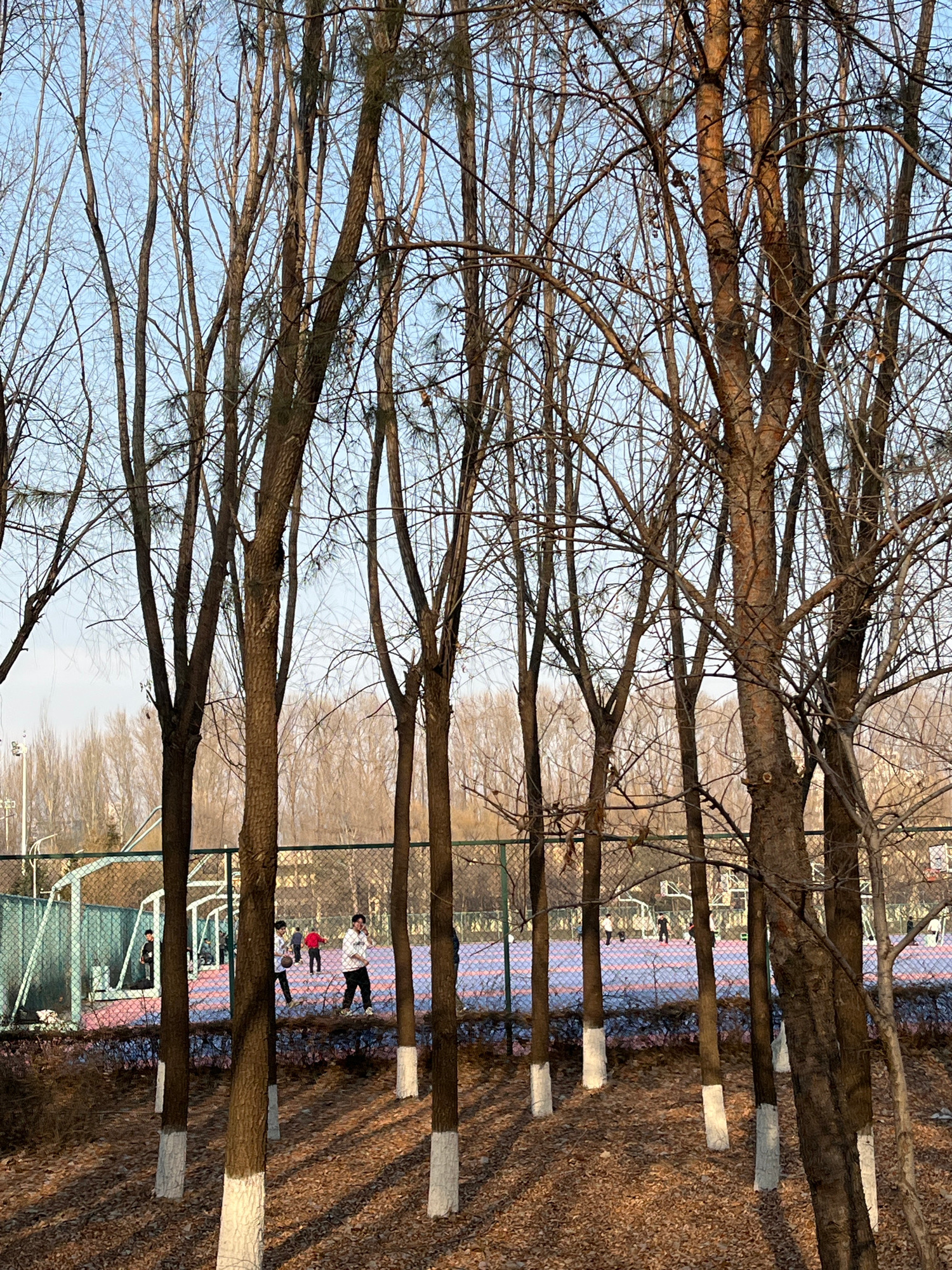 The image displays an outdoor scene in Changchun City, China, characterized by late afternoon sunlight and bare trees, indicative of late autumn or early winter. In the foreground, numerous deciduous…read more