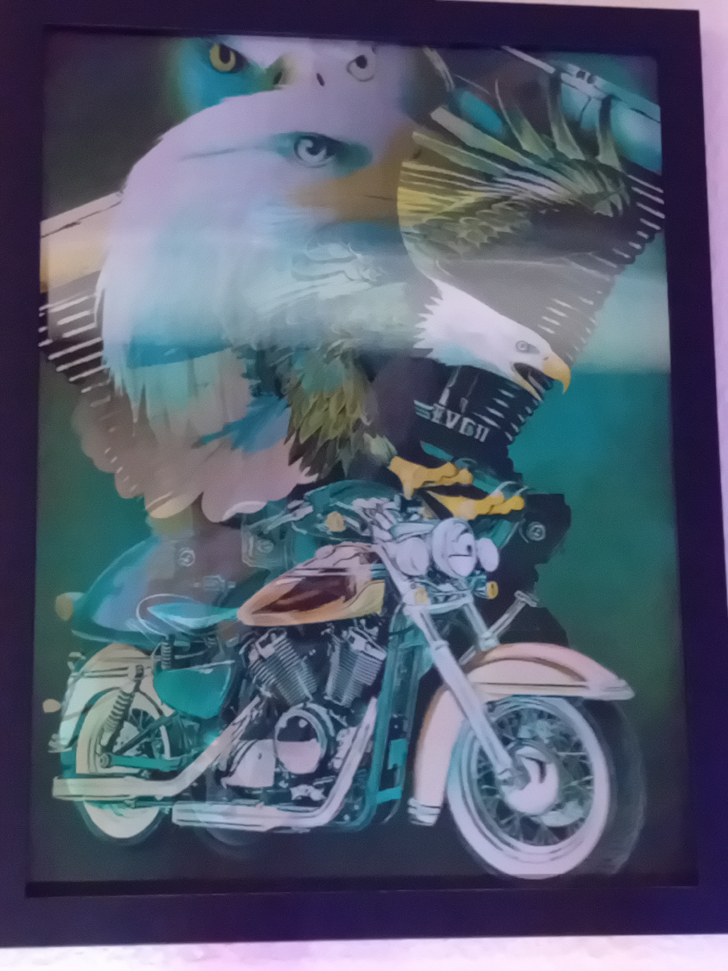 The image is a framed artwork depicting a composite of an eagle and a motorcycle engine. The eagle's head and wing blend with the engine, creating a merged image. The background is a muted green. Theβ¦read more