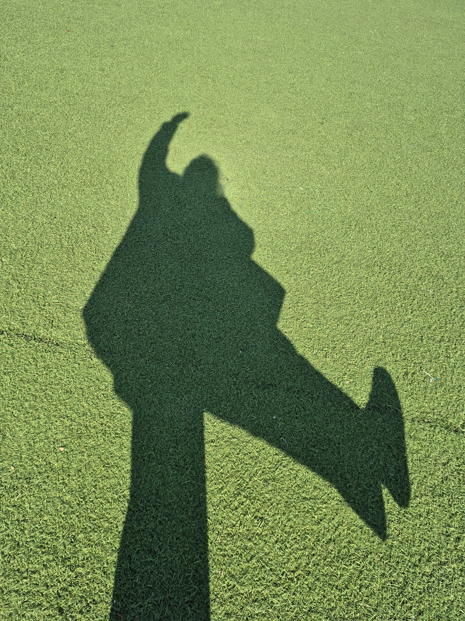 A large, dark shadow is cast across a vibrant green artificial turf surface, occupying the majority of the frame. The shadow's intricate shape suggests a person holding an elongated object. On the lefβ¦read more