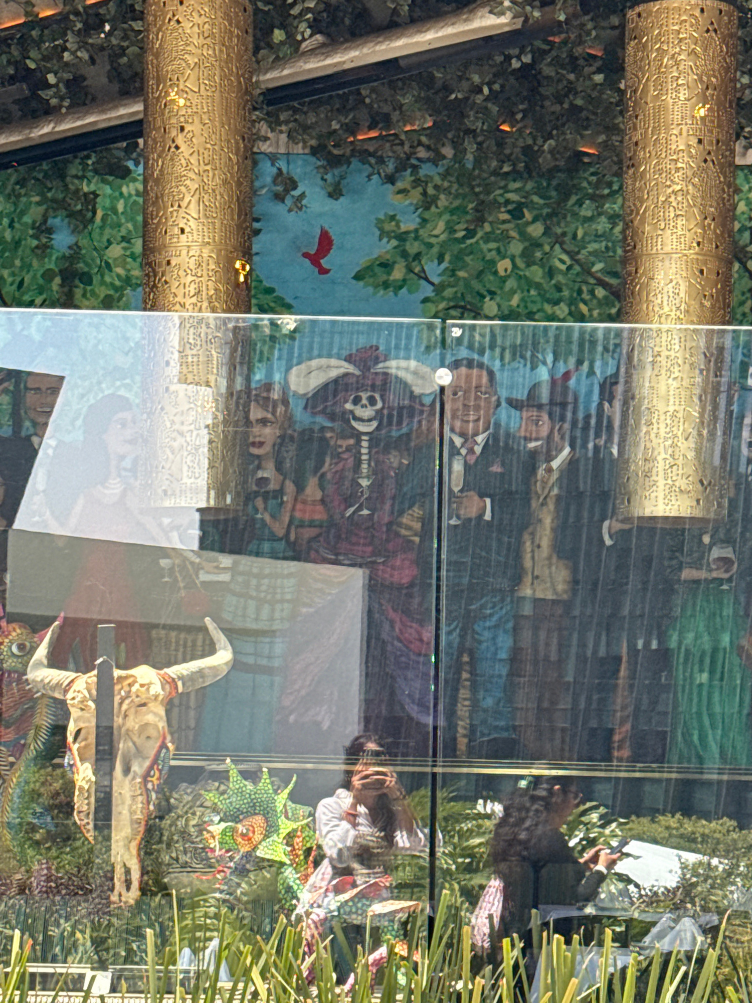 The image shows a window display in Mexico City, Mexico. The display features a combination of art pieces and decorative elements reflecting Mexican culture and history. The glass pane is reflecting t…read more
