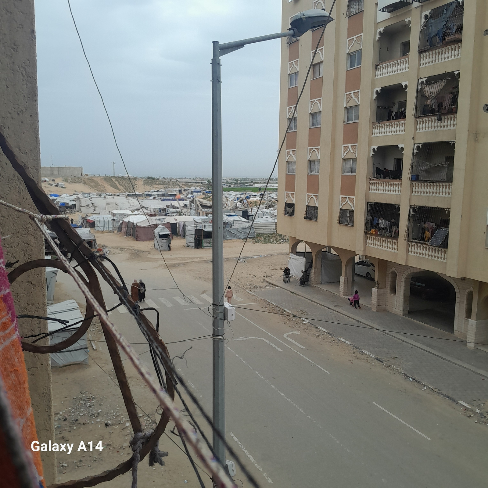 The image shows an elevated view in Khan Yunis, Palestinian Territory, looking towards a densely populated area of makeshift shelters, possibly a refugee camp or informal settlement. A multi-story bui…read more