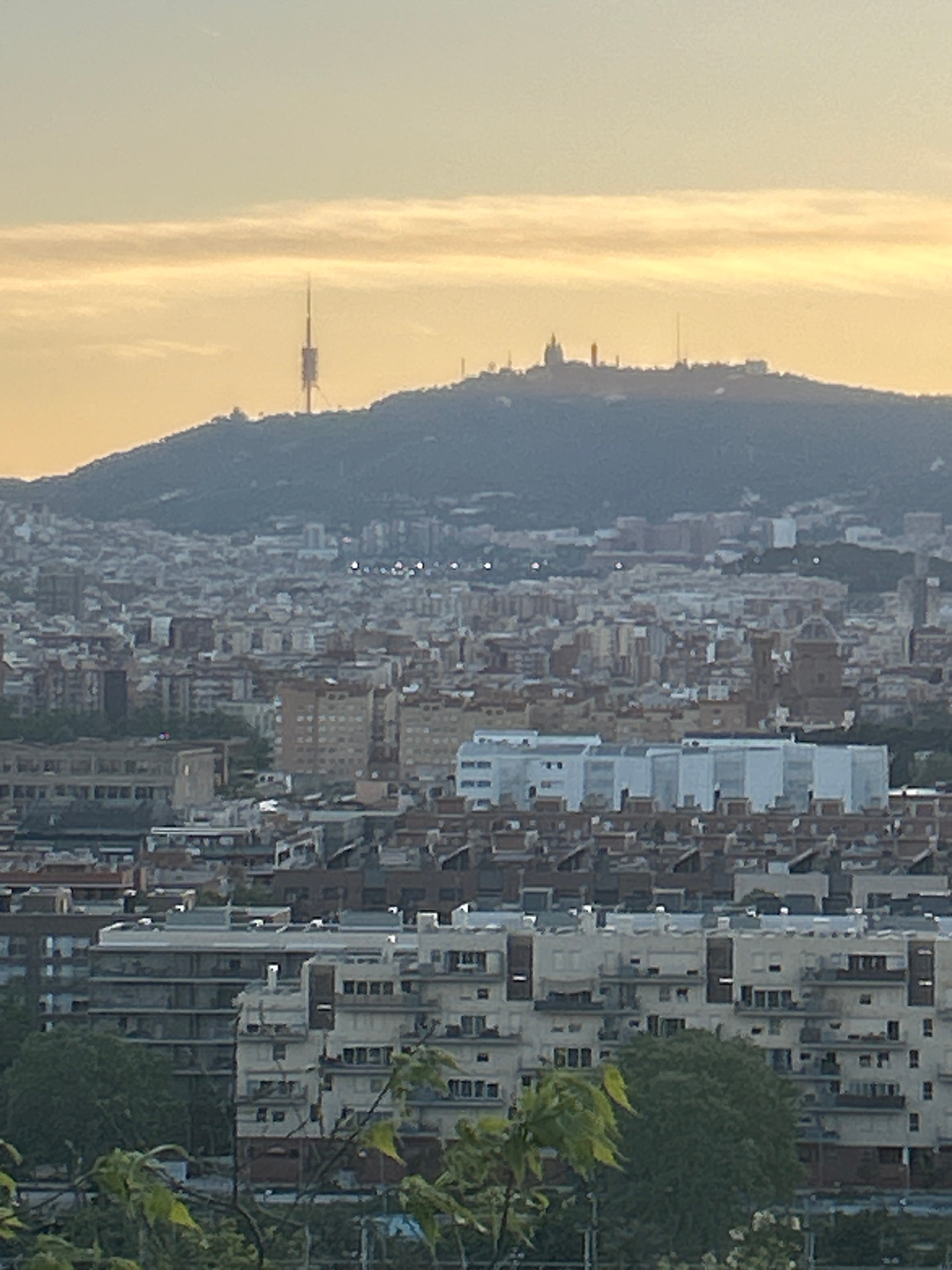 The image depicts a cityscape at dusk, likely taken from a high vantage point in Santa Coloma de Gramenet, Spain. The foreground includes foliage, partly obscuring a dense urban landscape of closely p…read more