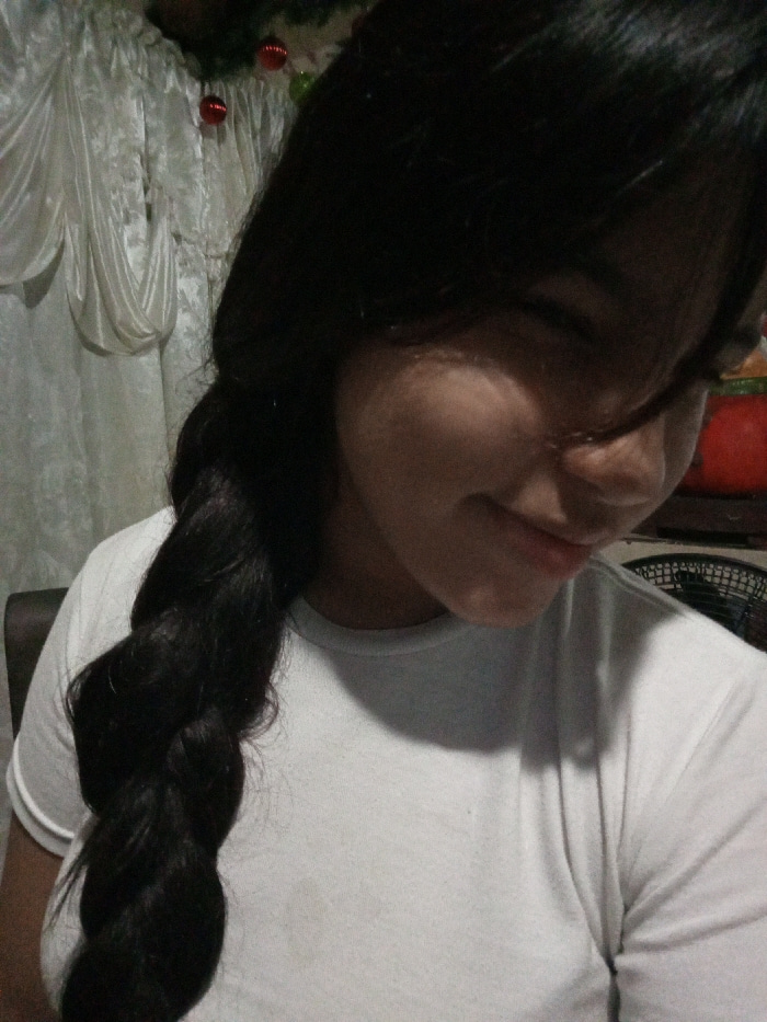 A woman with long, dark hair styled in a thick braid over her left shoulder is visible. She is wearing a plain white t-shirt. Her face is angled downward, with her eyes nearly closed, suggesting a shy…read more