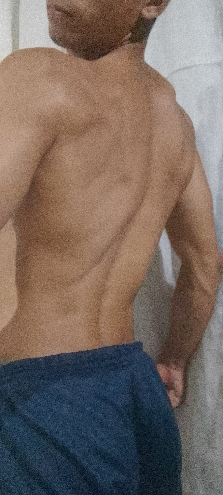A man stands with his back facing the camera, showcasing defined back muscles and arm muscles. He is wearing blue shorts. The background appears to be a plain wall, possibly white or light-colored. Th…read more