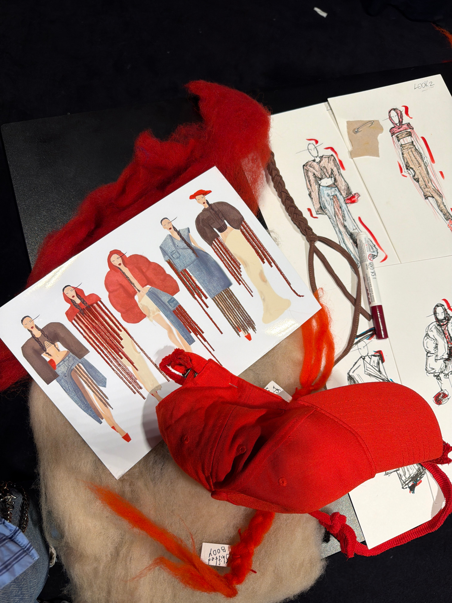 A high-angle shot displays an assortment of design-related items arranged on a dark surface. In the top-left corner, two fashion sketches, titled "Look 1" and "Look 2," are partially visible. Below th…read more