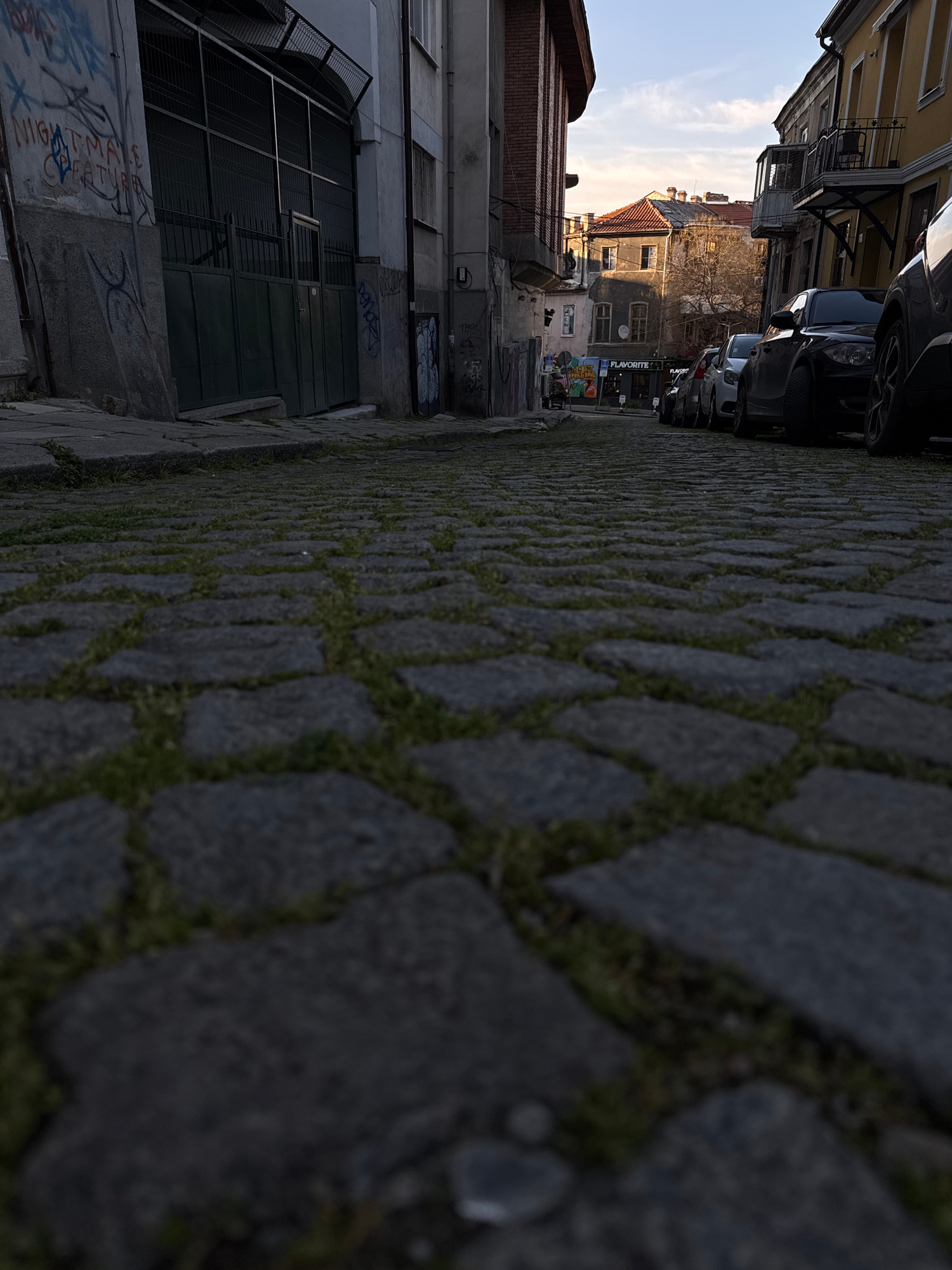 The image depicts a narrow cobblestone street in Plovdiv, Bulgaria. The street is flanked by buildings on either side, with cars parked tightly along the right. The pavement is gray and uneven, with g…read more