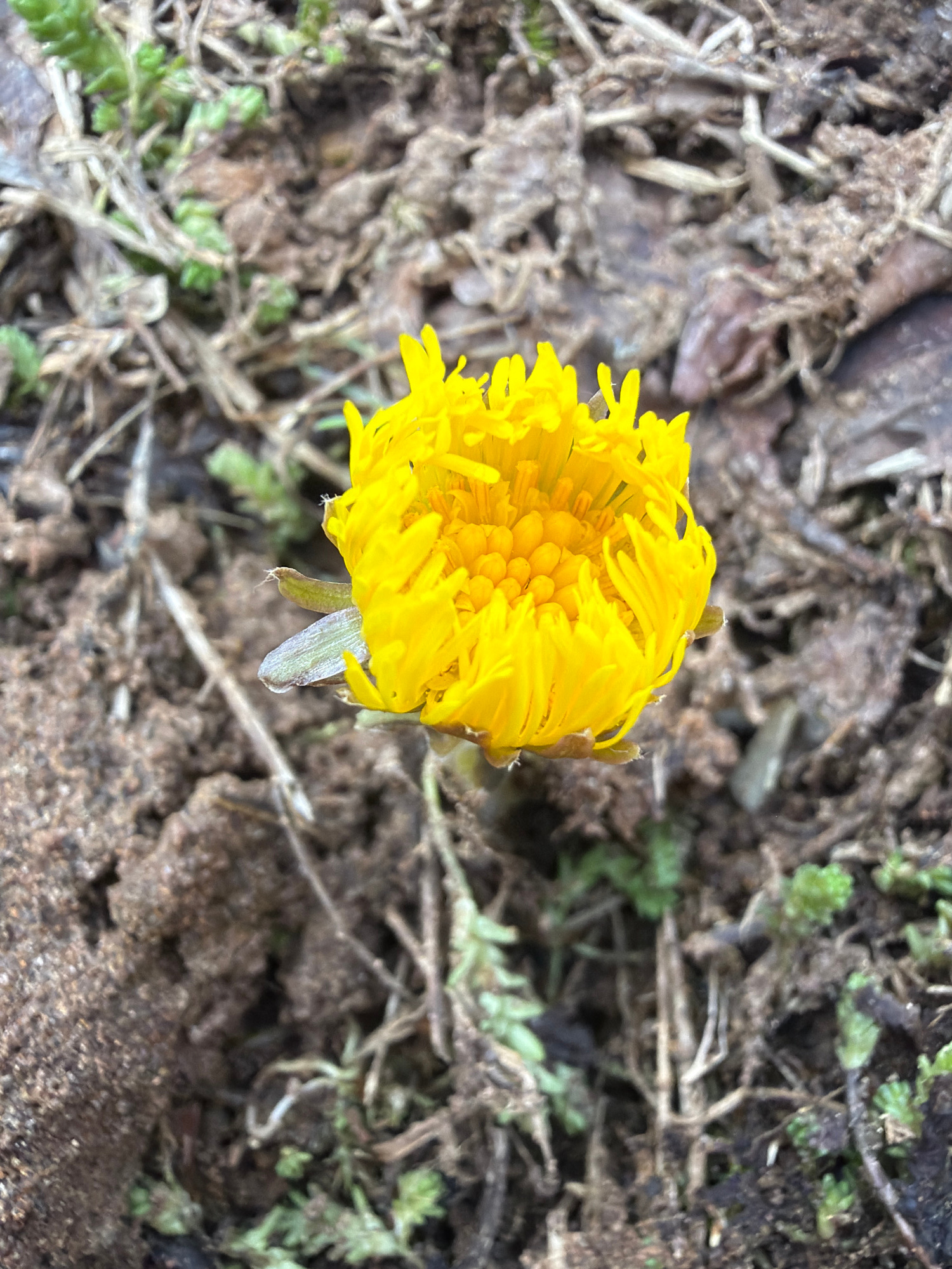 A close-up overhead shot shows a bright yellow flower growing from the ground in Markovo, Russia. The flower has many thin petals and a dense, rounded center. The surrounding ground is a mix of dirt,…read more