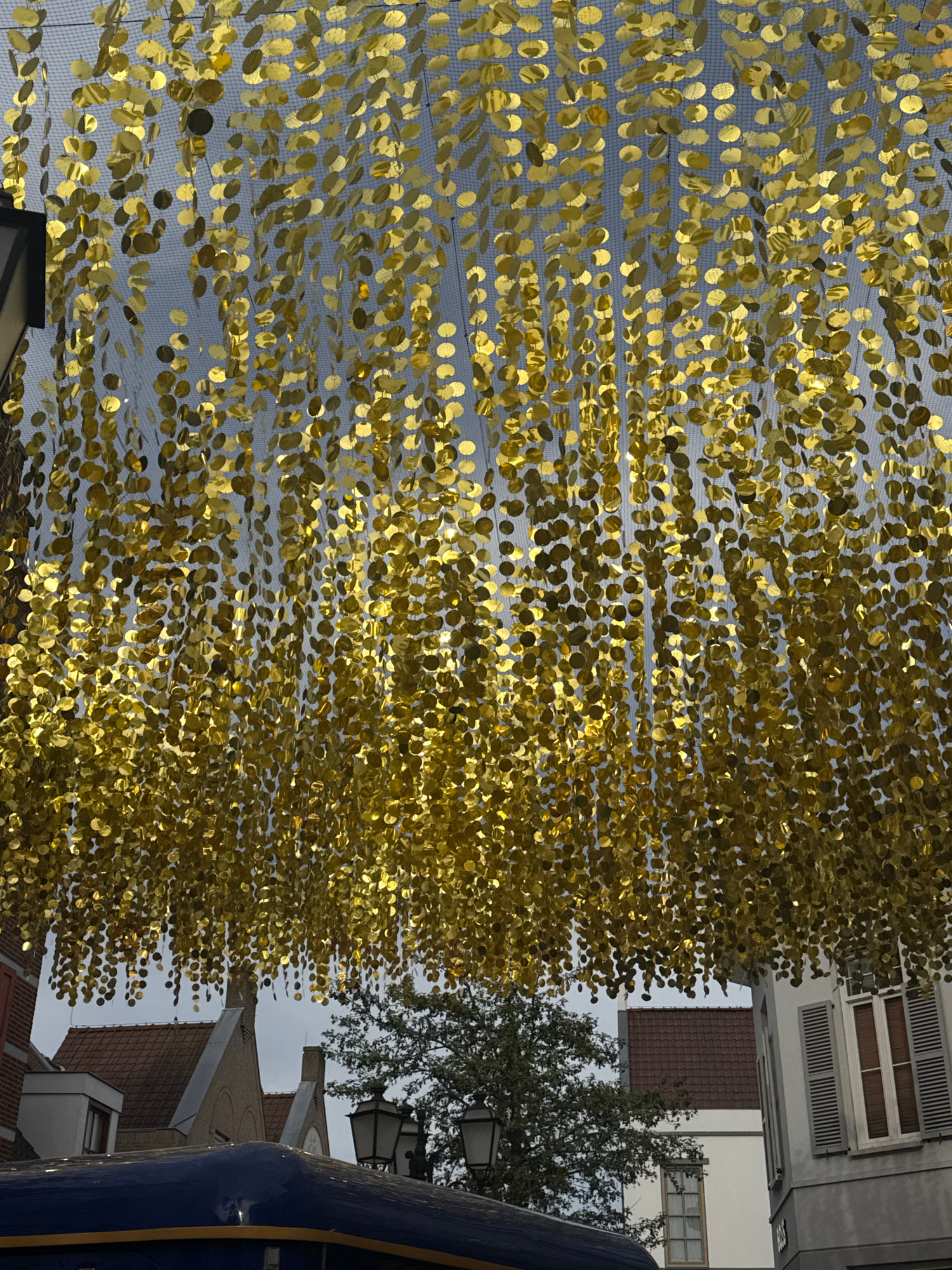 The image captures a street in Roermond, Netherlands, adorned with an overhead installation of numerous small, golden discs suspended on wires, creating a shimmering, curtain-like effect across the st…read more