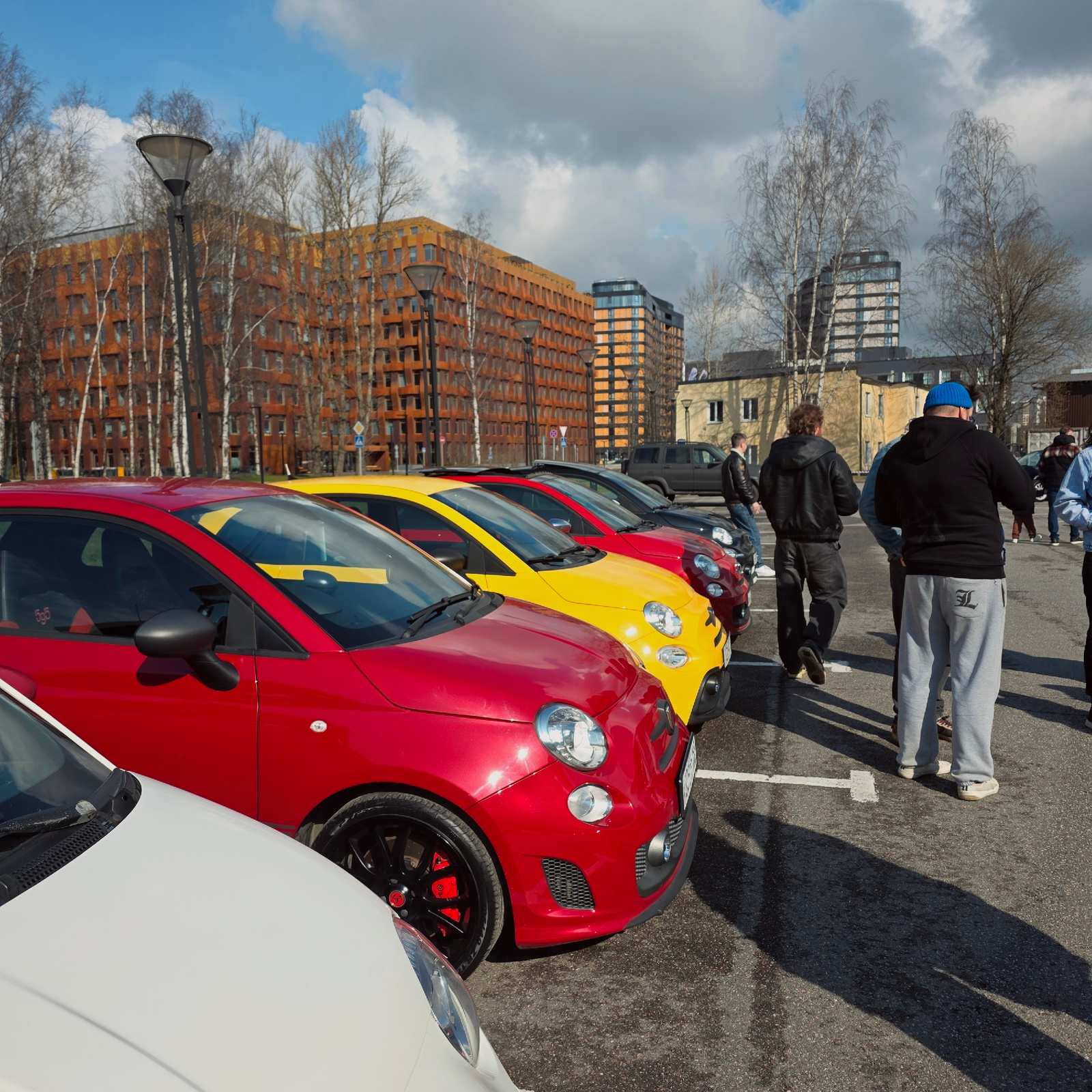The image captures a parking lot scene in Saint Petersburg, Russia, filled with a row of colorful Fiat 500 Abarth cars, dominated by red and yellow hues. Several individuals are visible: one wearing a…read more