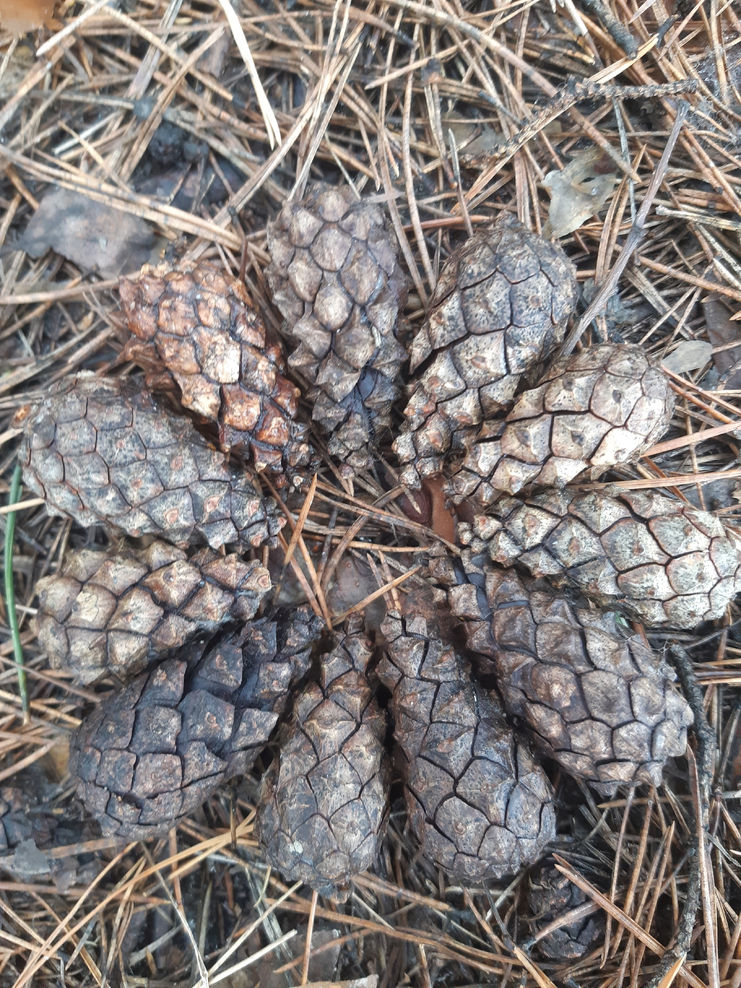 The image depicts a collection of pine cones arranged in a circular pattern on a bed of pine needles and forest floor debris. There are approximately ten visible cones, varying in color from light bro…read more