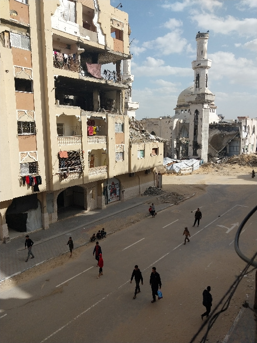 This image depicts a street scene in Khan Yunis, Palestinian Territory, characterized by significant structural damage to buildings under a partially cloudy sky. On the left, a multi-story building,…read more