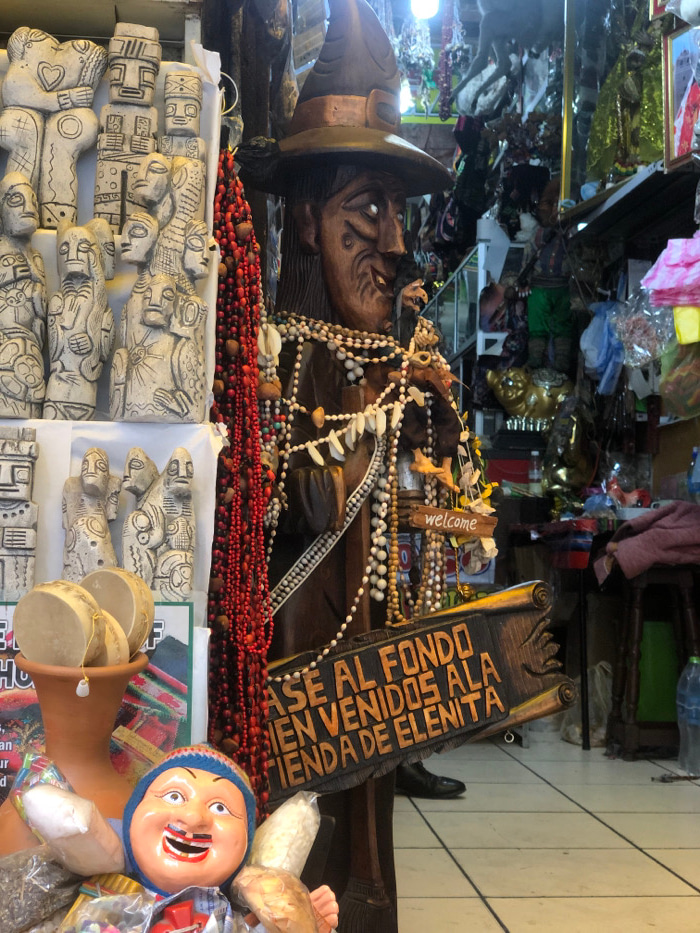 A crowded marketplace scene showcases an array of cultural items. Prominently, a wooden statue of a person with a hat is adorned with beads and shells. Red beads cascade over a display of carved stone…read more