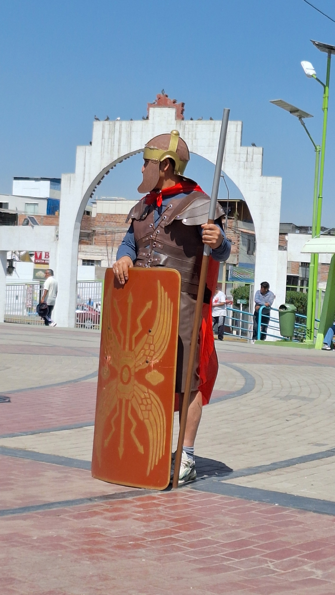 A costumed individual portraying a Roman legionary stands in Mariano Melgar, Peru. The person wears a brown helmet with a gold accent, a brown leather-like breastplate over a blue long-sleeved shirt,…read more