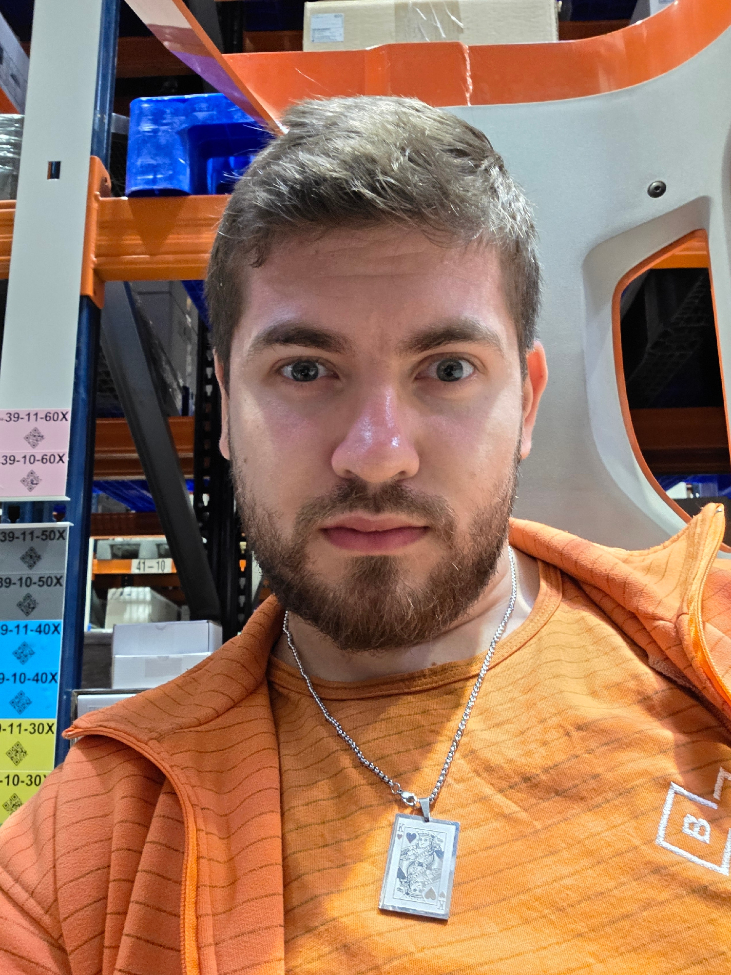 A close-up portrait of a man wearing an orange t-shirt and a silver necklace with a playing card pendant. He has a beard and graying hair. The background appears to be inside a warehouse or storage fa…read more