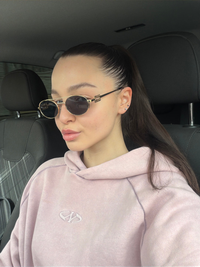 The image depicts a female individual seated within the passenger compartment of a vehicle, angled slightly to the viewer's left. Her dark hair is styled in a slicked-back high ponytail, revealing fin…read more