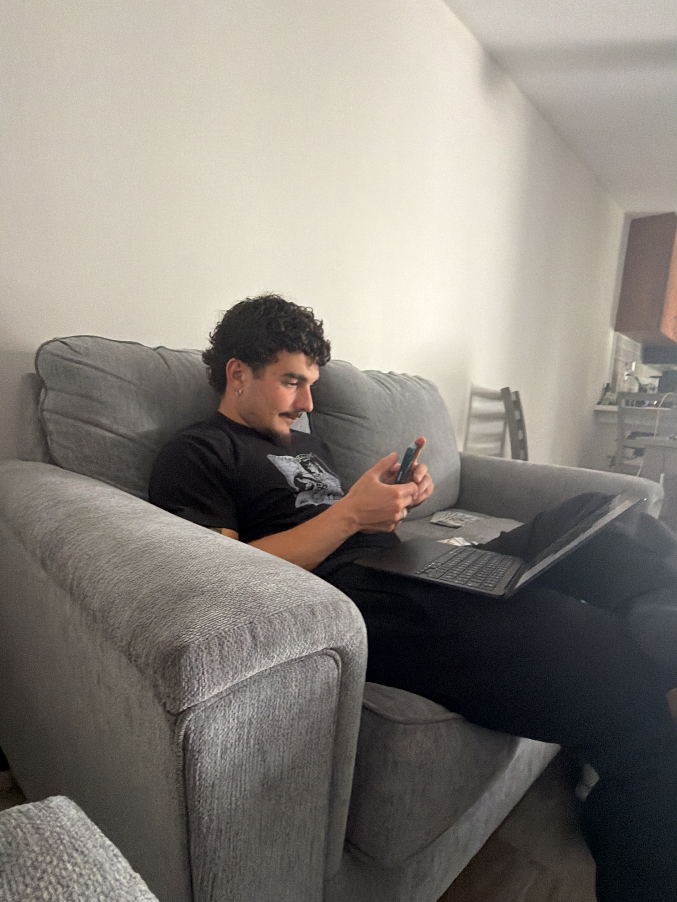 A man with dark, curly hair, a mustache, and a short beard sits comfortably on a large, grey fabric couch. He wears a black t-shirt with an indistinct graphic and black pants, along with an earring in…read more