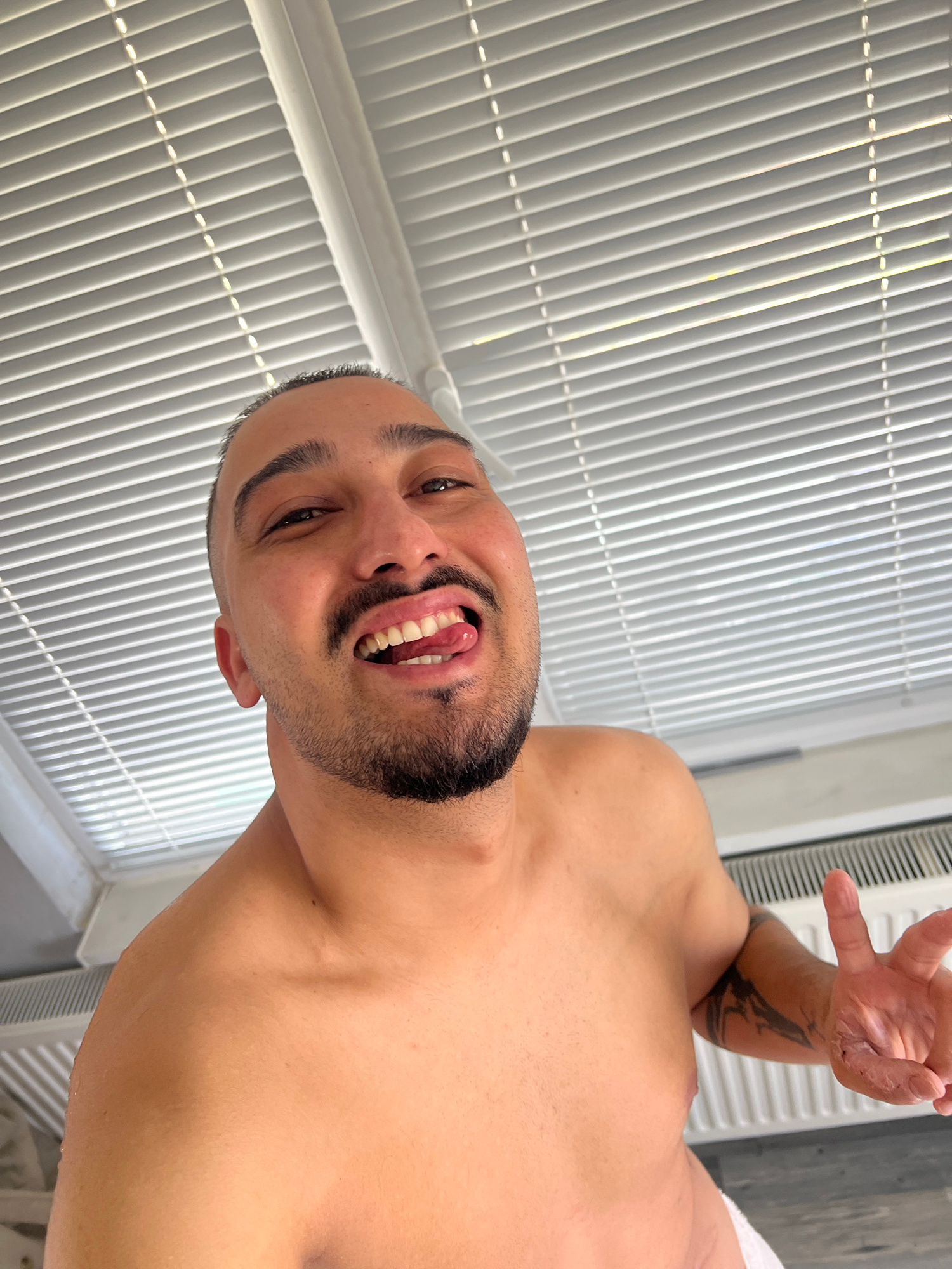 A shirtless man with a beard and short hair is lying on a bed in a room with white blinds on the window. He is sticking his tongue out and smiling. There appears to be a tattoo on his left arm. The lo…read more