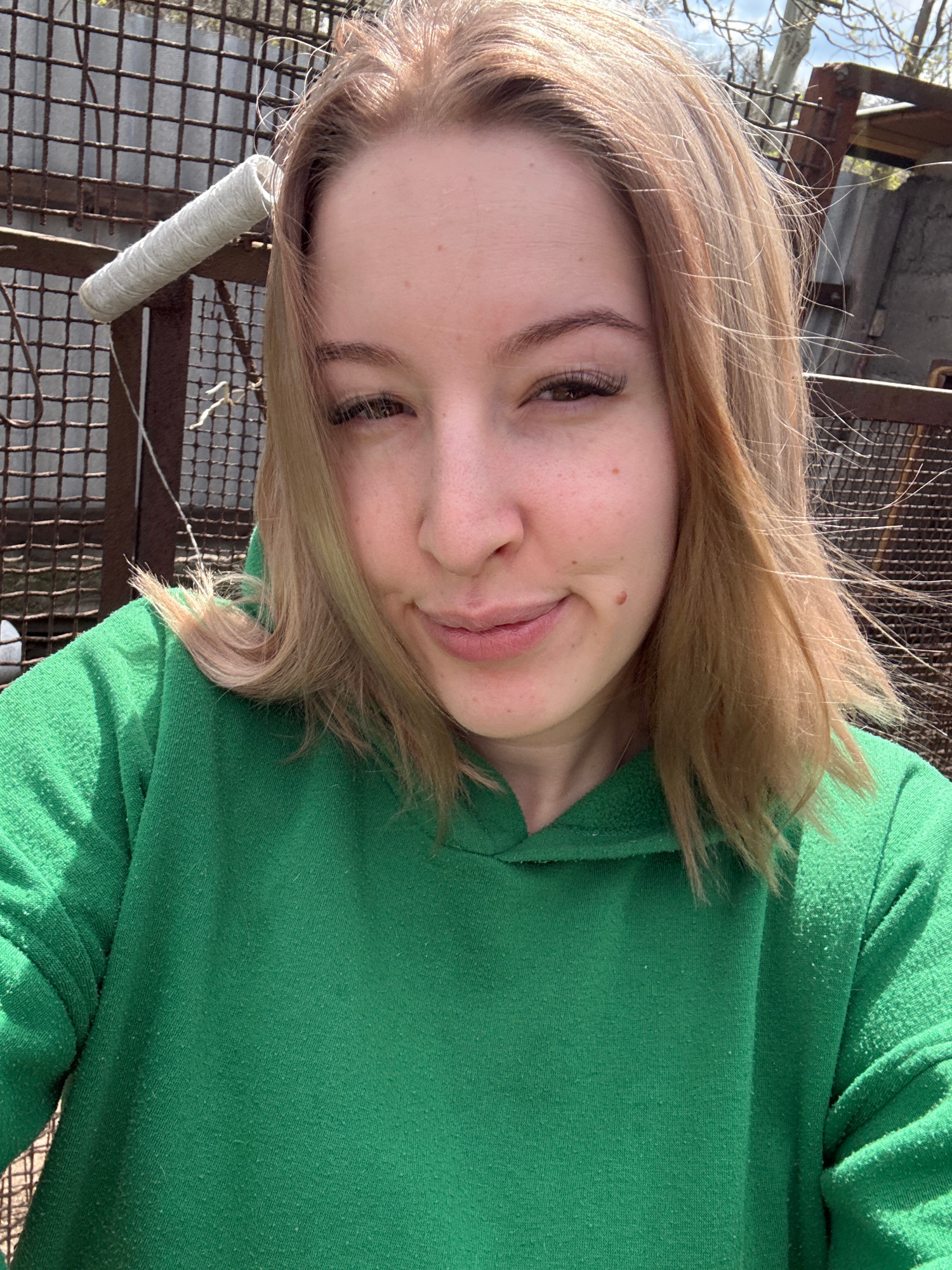 A young woman with fair skin, blonde hair, and wearing a green hoodie is posing for a selfie. The background includes a metal fence and a glimpse of trees under a bright sky. A white, cylindrical obje…read more