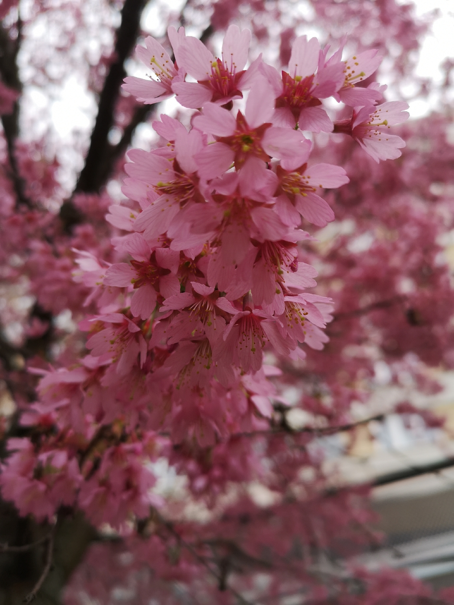 A close-up photograph, taken in Pardubice, Czechia, displays a dense cluster of pink blossoms from a flowering tree. The foreground features multiple individual flowers in sharp focus, each possessing…read more