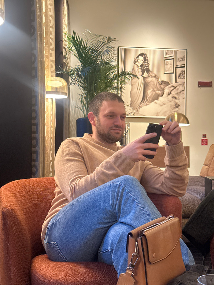 A man with short hair, wearing a light brown sweater and blue jeans, sits in an orange chair while looking at his phone. A brown purse is visible next to him. Behind him is a plant and a framed black…read more