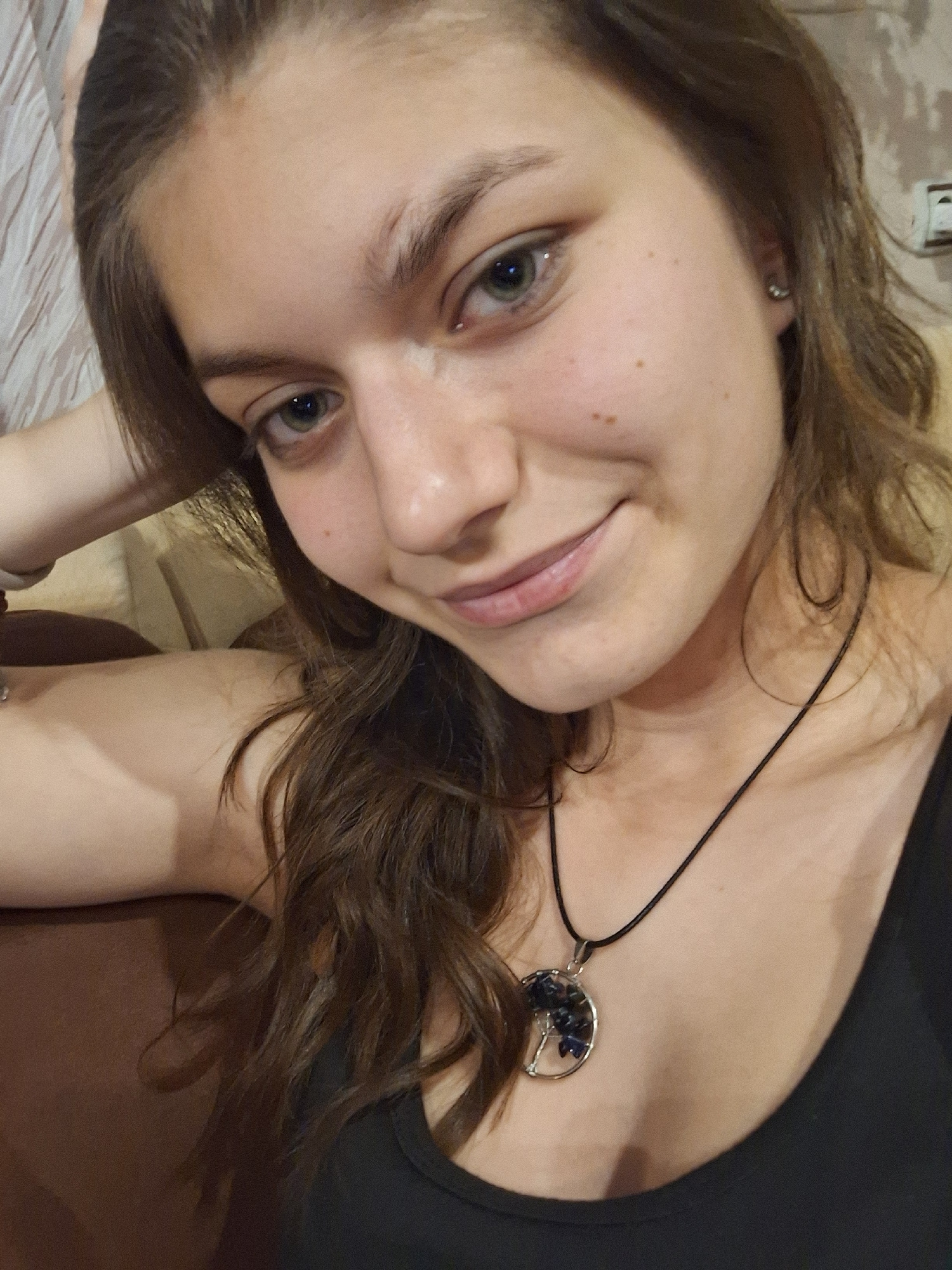 A woman with brown hair and light skin is positioned in the foreground. She is smiling and wearing a black top. A necklace with a circular pendant containing blue stones is visible around her neck. Th…read more