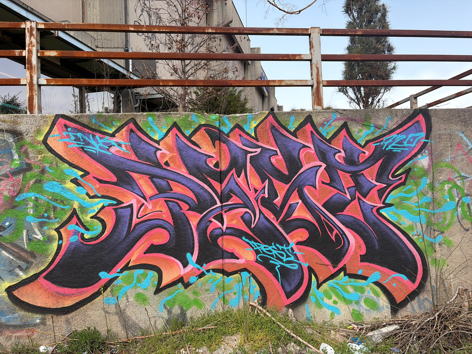 A concrete wall features a large, intricate graffiti artwork in shades of black, purple, orange, and pink. The artwork is accented with blue highlights and lettering. The wall is also marked with gree…read more