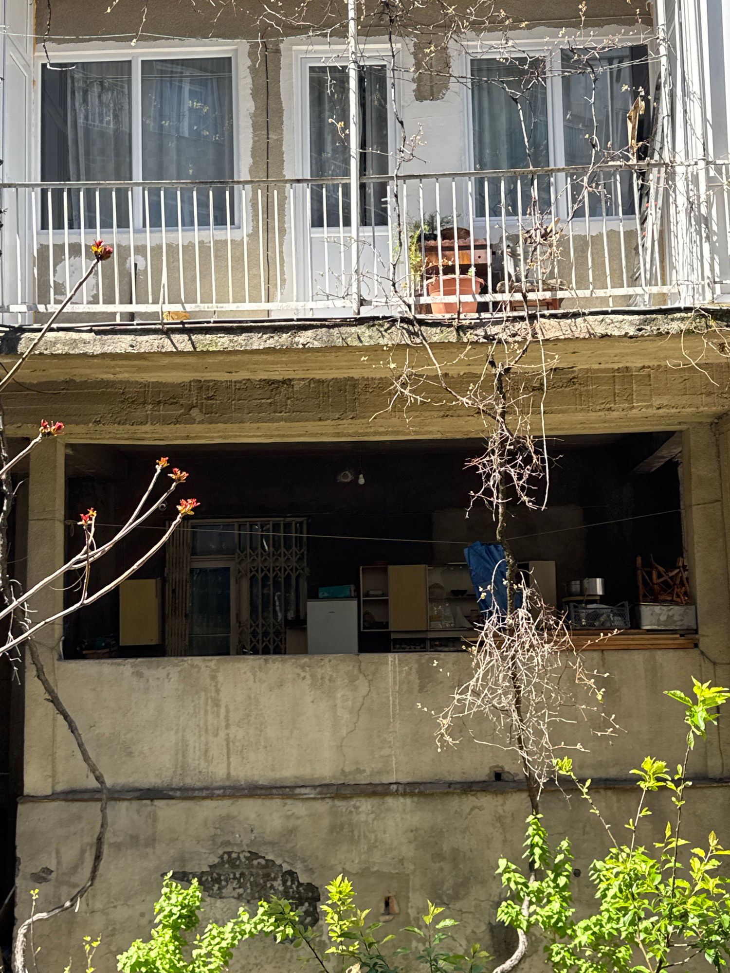 An eye-level medium shot captures the architectural details of buildings and a courtyard in Tbilisi, Georgia. The image is vertically oriented. The left side of the frame is dominated by a white build…read more