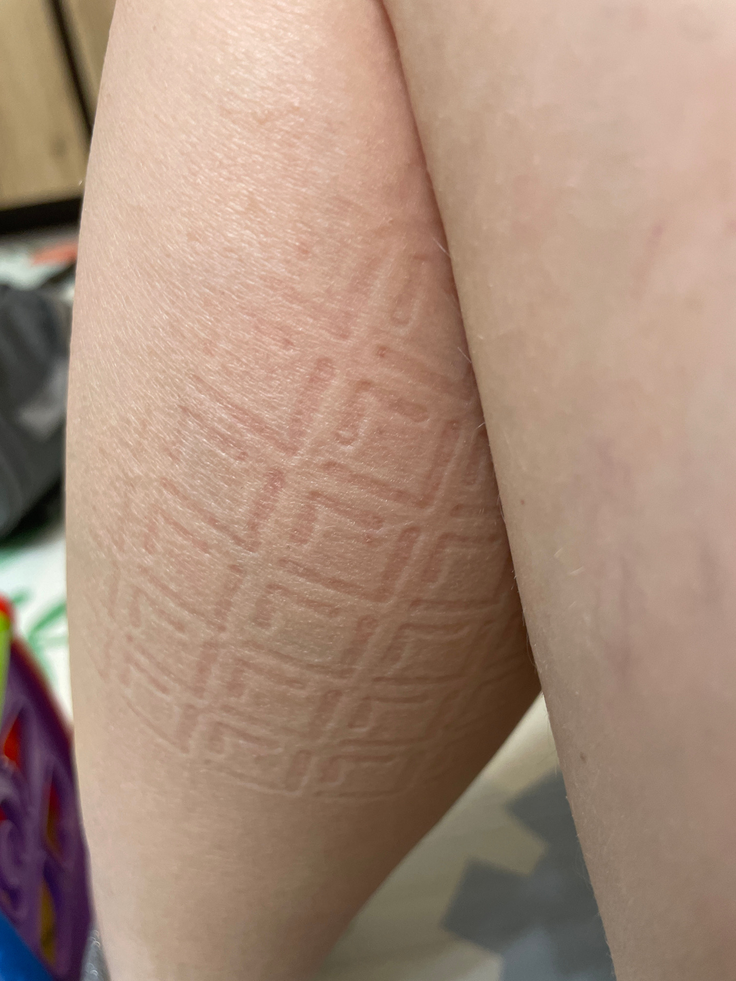 An arm has been indented with a patterned grid that is raised as wheals on the skin. There is no information visible in this image that relates to the city of Chaikovsky, Russia.