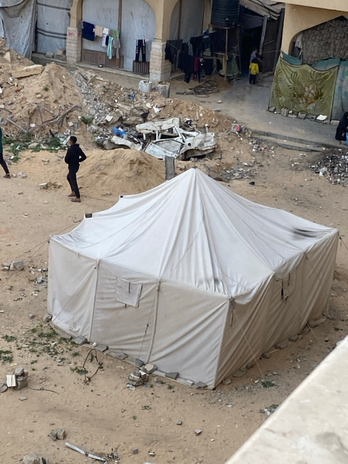 The image captures an outdoor scene, rotated approximately 90 degrees counter-clockwise, depicting a makeshift encampment or an area affected by disarray, viewed from a high vantage point looking down…read more