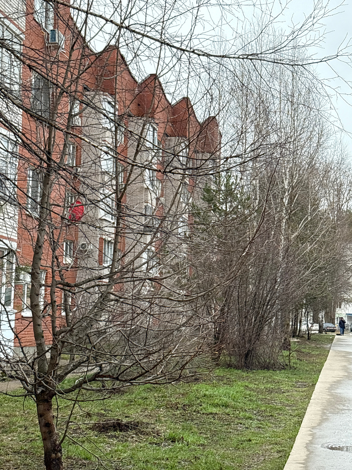 A street scene in Chaikovsky, Russia, shows a multi-story brick building obscured by bare trees. The building has a distinctive stepped roofline. To the right, a strip of green suggests a park or gras…read more