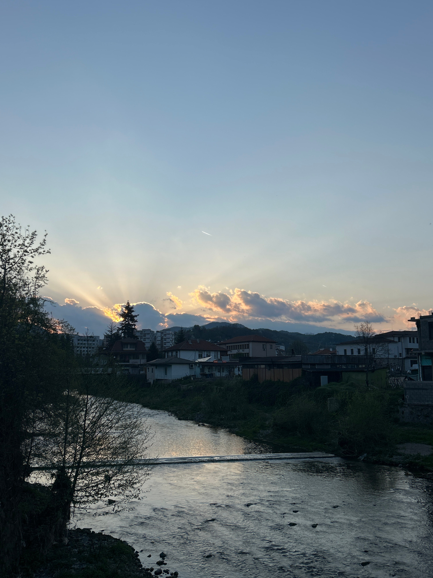 The image depicts a river flowing through Zlatograd, Bulgaria. Buildings line the riverbank on one side. The sky above features light blue hues and sun rays peeking through clouds, partially obscuring…read more