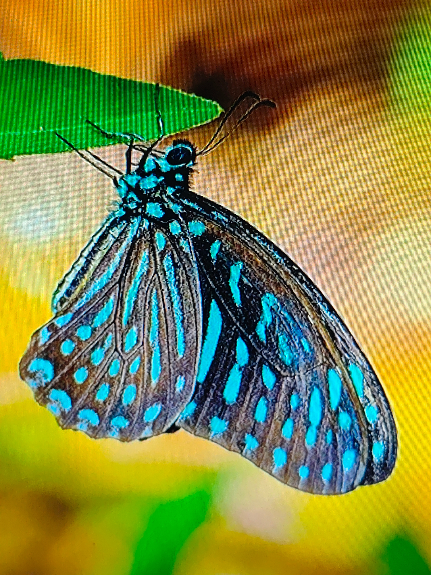 A vibrant image captures a blue butterfly perched beneath a green leaf. The insect's wings display a pattern of blue spots and streaks against a dark background, while its head is marked with blue pat…read more