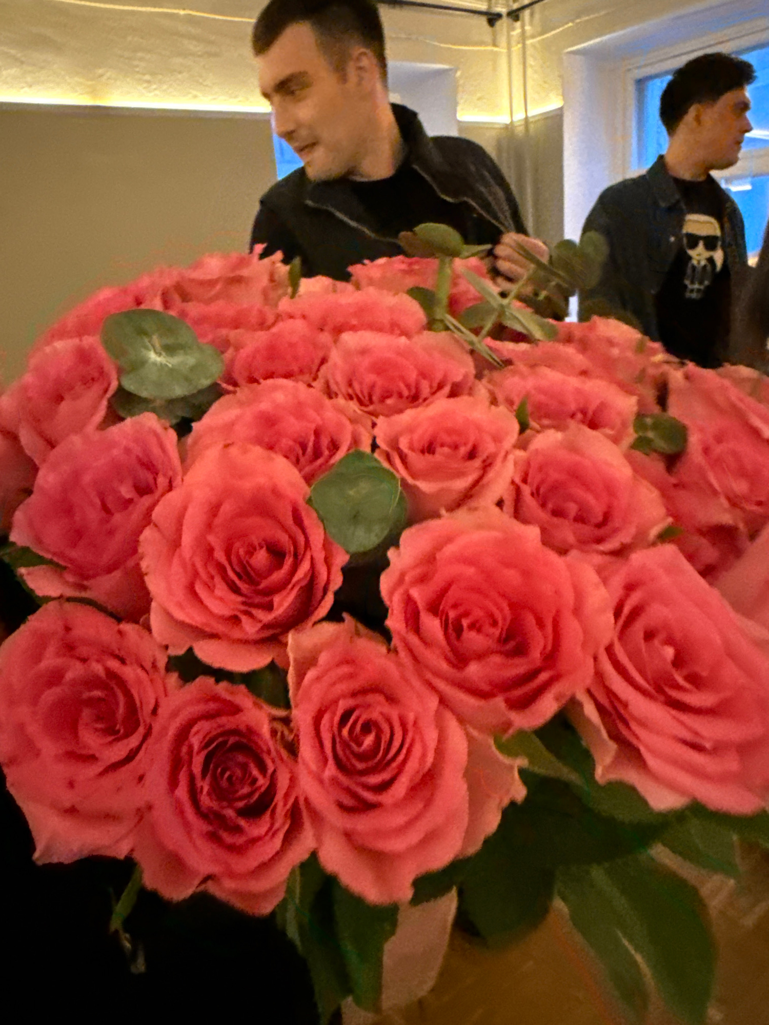 A man holds a large bouquet of pink roses. The location appears to be indoors, possibly a residential space. From the top left, a window is seen. The location is in Moscow, Russia. The man is wearing…read more