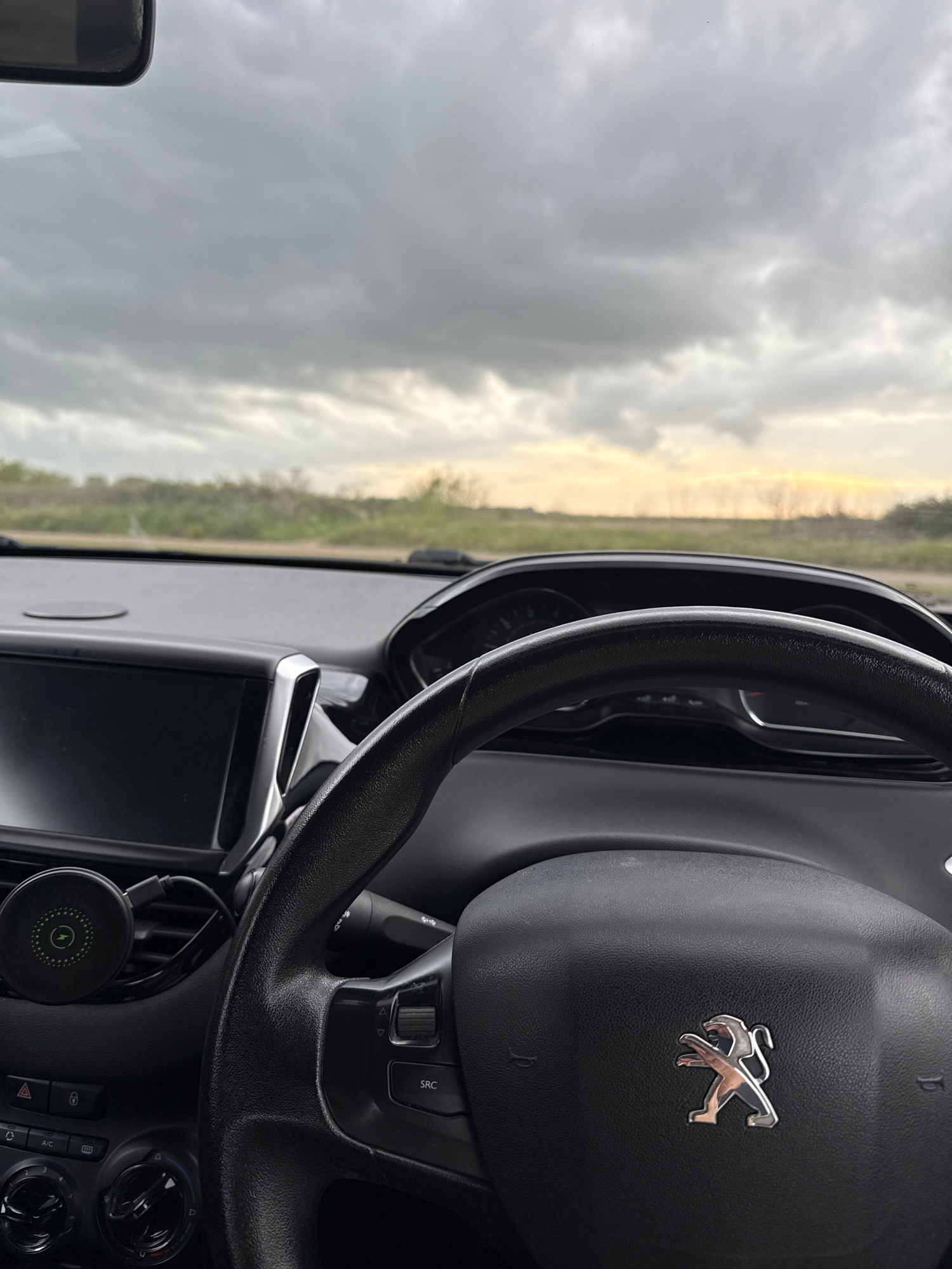This media file captures a view from the interior of a car, looking out through the windshield towards the sky and a distant horizon. The image is presented vertically, with the car's interior details…read more