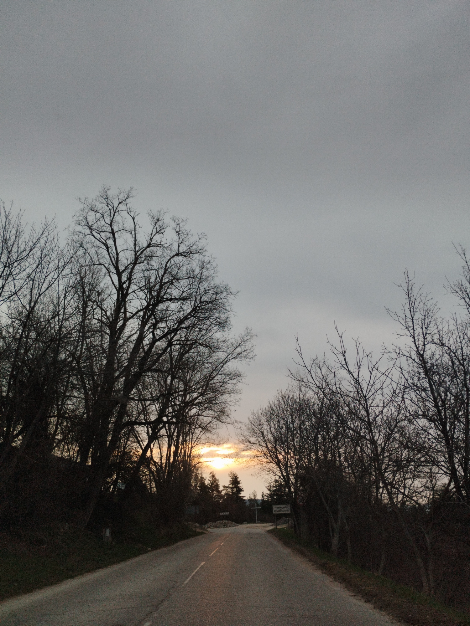 The image shows a road leading towards the setting sun, flanked by bare trees on both sides. The sky is overcast, creating a muted, grey atmosphere. In the distance, a sign indicates the location as Cā¦read more