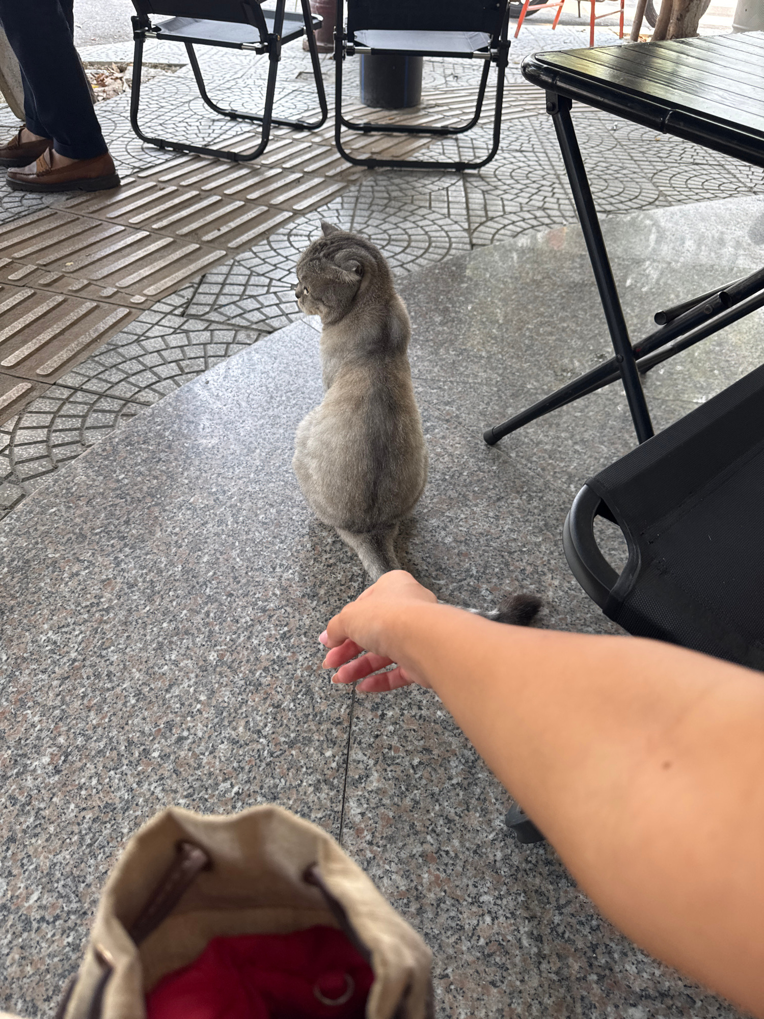 A person's arm and hand reach toward a grey cat on a grey stone surface. A backpack sits to the right of the hand. Chairs are visible on the left side of the image. The location appears to be outdoors…read more