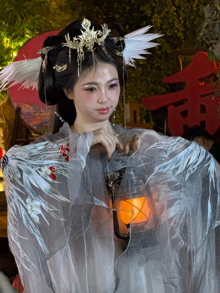 The image presents a portrait of a young woman in an elaborate, traditional-inspired costume, set against a dimly lit background, suggesting nighttime or an indoor themed environment. She is positioned facing slightly towards the viewer, with her head tilted, and her gaze directed towards the camera. The woman has fair skin and dark hair styled in an intricate updo, adorned with numerous gold-colored hairpins and ornaments that feature delicate metallic designs, possibly depicting flora or mythical creatures. Some of these ornaments include dangling chains with small pearls or beads. Prominently placed are large, white, feather-like adornments that resemble crane feathers, positioned on both sides of her head, adding to the ethereal aesthetic. Her makeup includes shimmery eyeshadow, winged eyeliner, and glossy, light pink or peach-colored lips, with visible blush on her cheeks. She is wearing a flowing garment made of a light-colored, possibly sheer, fabric. The costume appears to be a Hanfu or a fantasy garment inspired by traditional Chinese aesthetics. Parts of the fabric, particularly on the sleeves or sash, are embroidered with detailed patterns of white, silver, and red botanical motifs, resembling flowers and leaves. Her hands are delicately posed; one hand rests near her chest, while the other holds a decorative lantern. The lantern, metallic with glass panels, emits a warm, orange glow, providing the primary light source in the image and casting a soft illumination on her and her costume. The light from the lantern creates a glowing effect on the sheer fabric of her dress. In the background, out of focus, are dark green elements that suggest foliage or trees, alongside a large, red, blurred object. This red object appears to be a stylized Chinese character, potentially part of a sign or decoration. It looks like the right half of a character, possibly "華" (huá, meaning magnificent or China), positioned vertically. The overall atmosphere is enchanting and cultural, evoking a sense of ancient elegance or a mythical setting, possibly at a festival or themed event. | Open Wire
