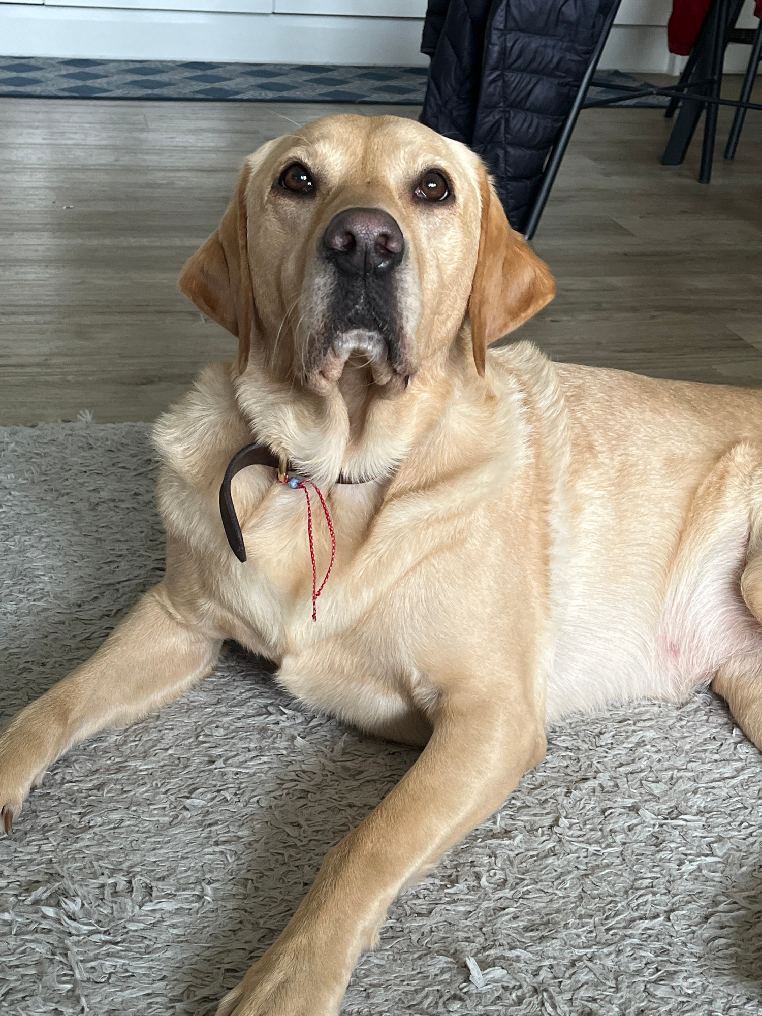 A tan Labrador Retriever lies on its back on a gray, shaggy carpet. Its head is turned to face the camera, with its mouth slightly open and brown eyes visible. The dog wears a dark brown collar with a…read more