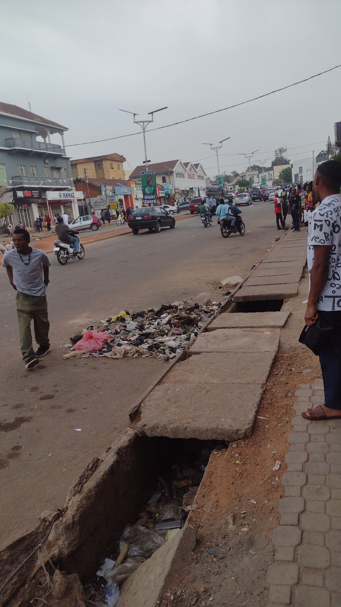 The image depicts a street scene in Jos, Nigeria. The foreground shows a concrete drainage ditch filled with refuse and a large pile of litter on the roadside, including plastic bags and assorted debr…read more