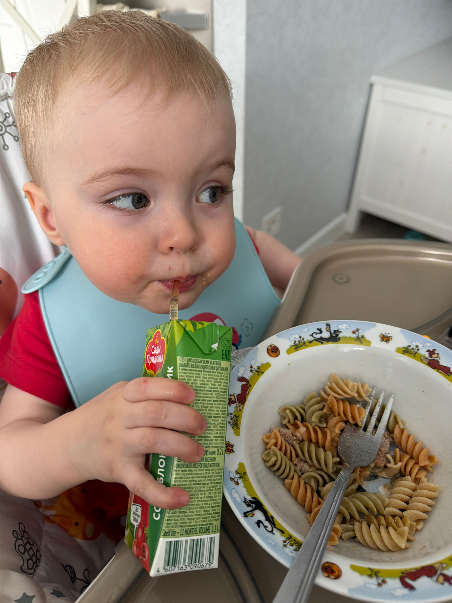 A close-up, slightly angled overhead shot shows a young child in a highchair drinking from a juice box. The child has light skin, blonde hair, and blue-grey eyes. A light blue bib covers a red shirt.…read more