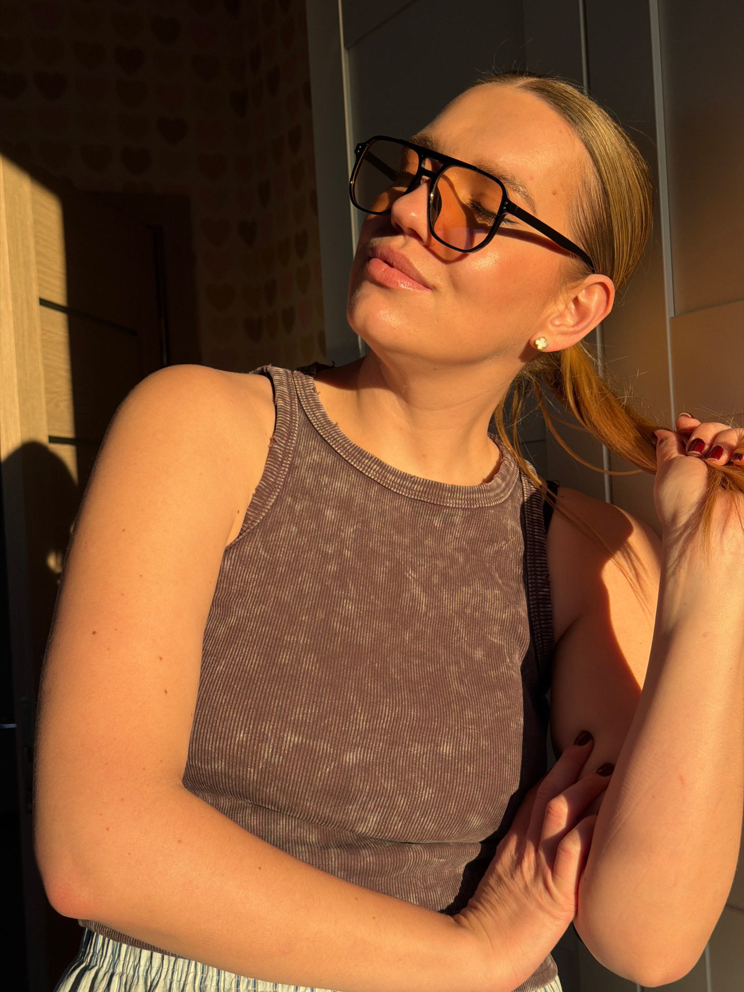 A woman with blonde hair, wearing black glasses, is shown in the image. She is wearing a brown striped tank top and is holding a strand of her hair with her hand. Her nails are painted dark red. She i…read more