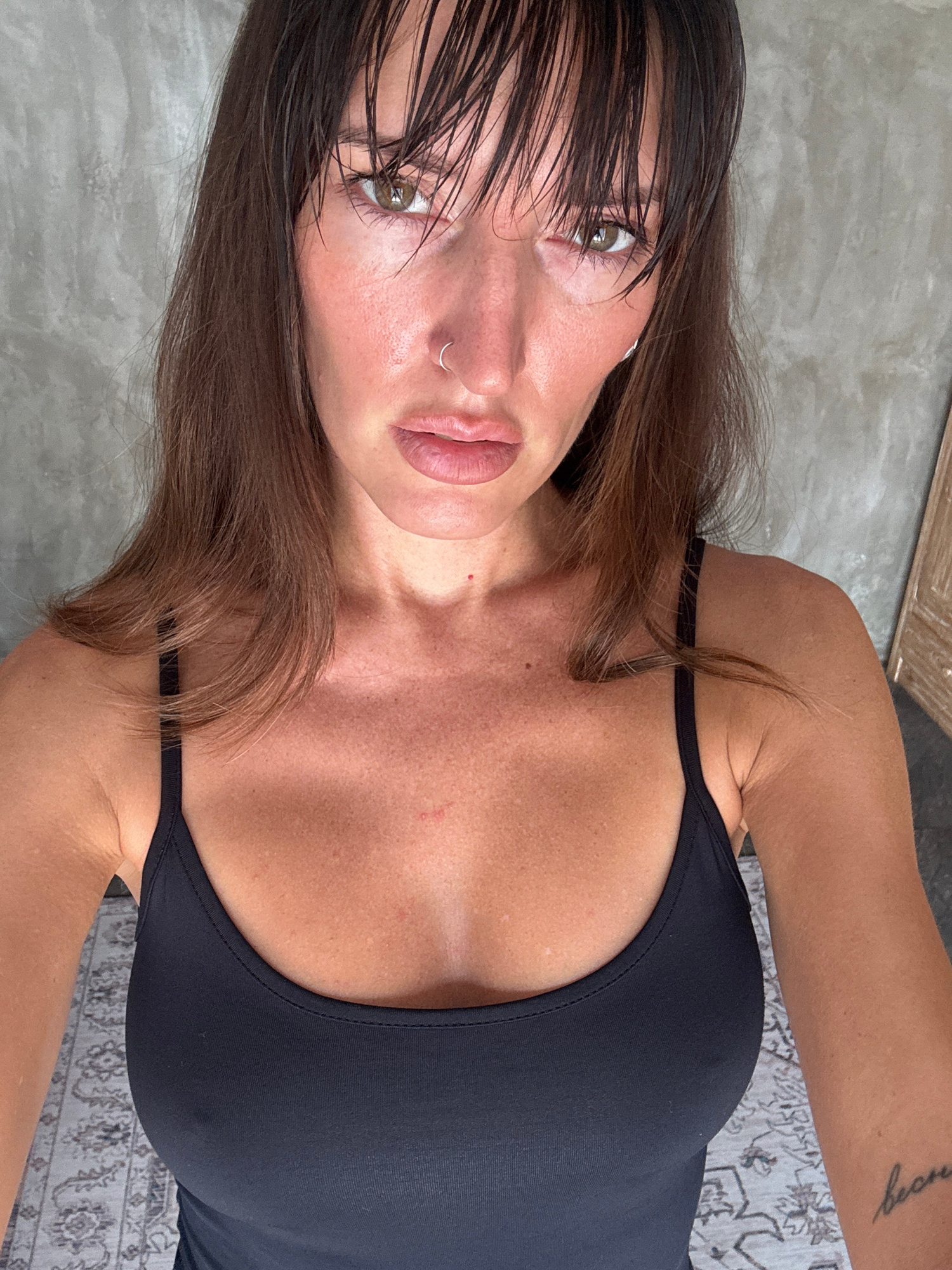 A woman with wet, dark brown hair is pictured indoors from a high angle. She has fair skin and is wearing a black top with thin straps. Her lips are tinted pink, and she has a silver nose ring in herβ¦read more