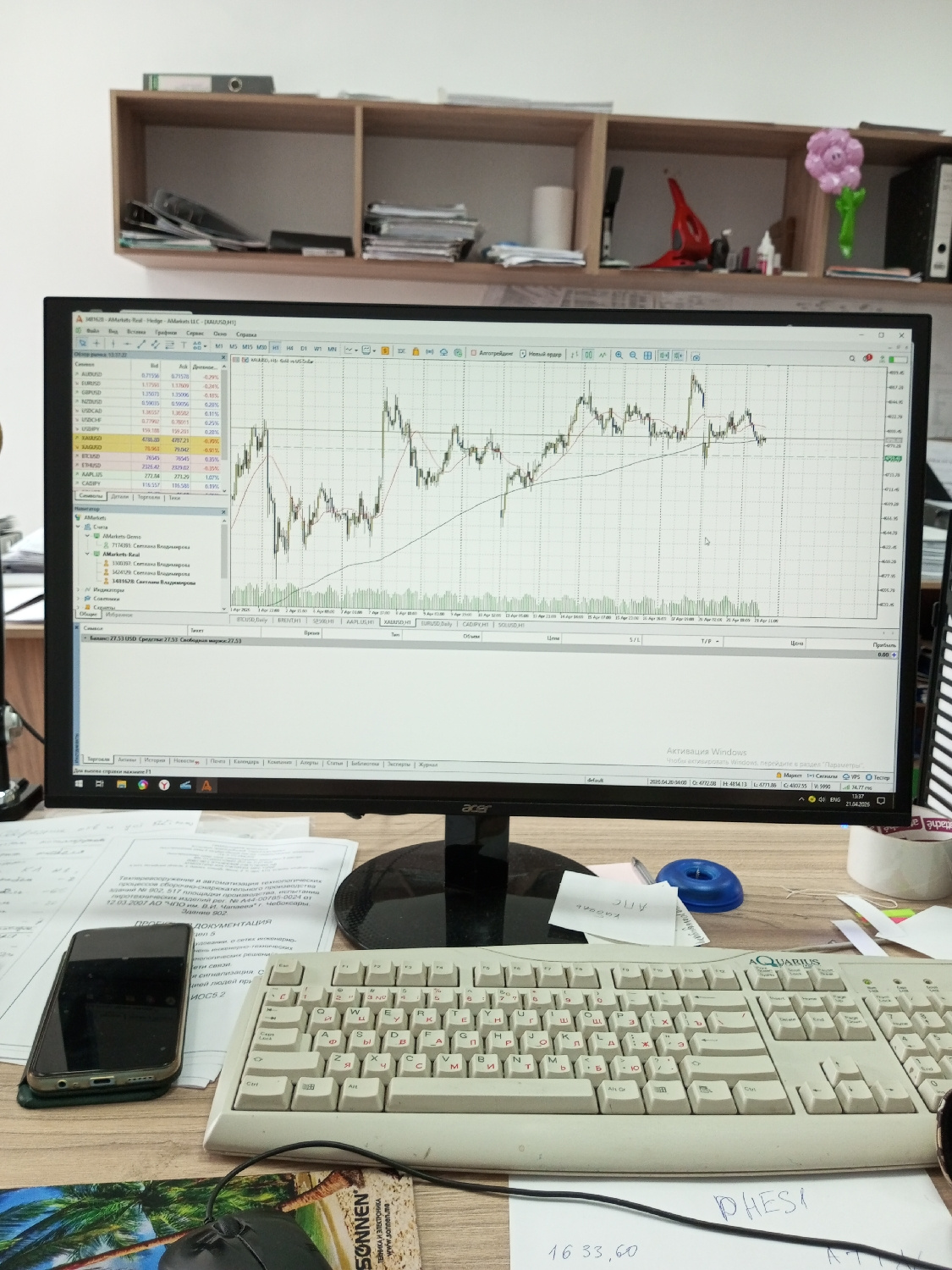 An indoor scene captures a cluttered desk and a computer monitor displaying financial trading software. The primary subject is an Acer monitor, showing a candlestick chart for XAUUSD (Gold) within a p…read more