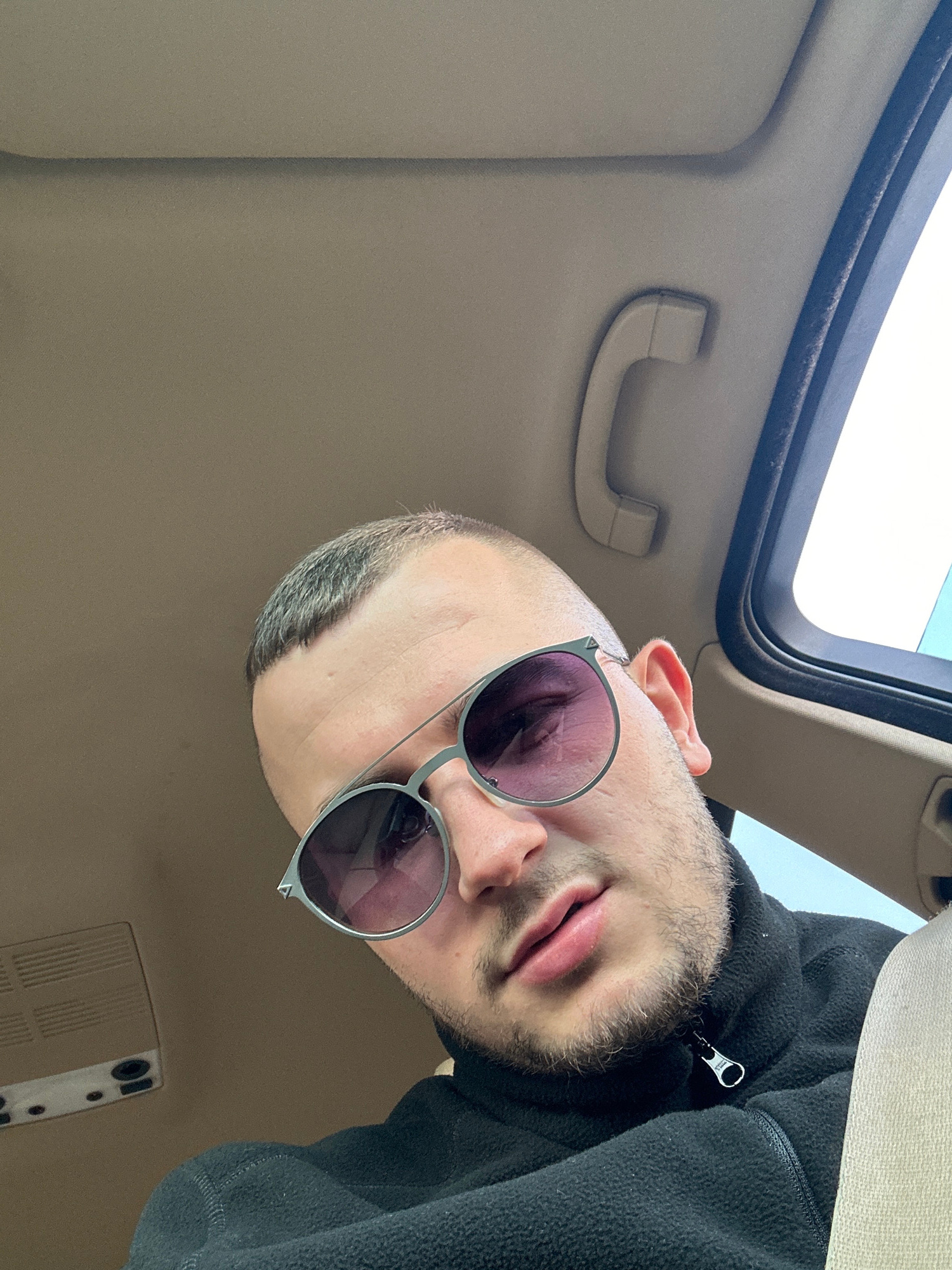 A man with sunglasses is in a car, presumably in Plovdiv, Bulgaria, given the prompt's instruction. The man has short, dark hair and is wearing a black fleece jacket. He is positioned close to the cam…read more
