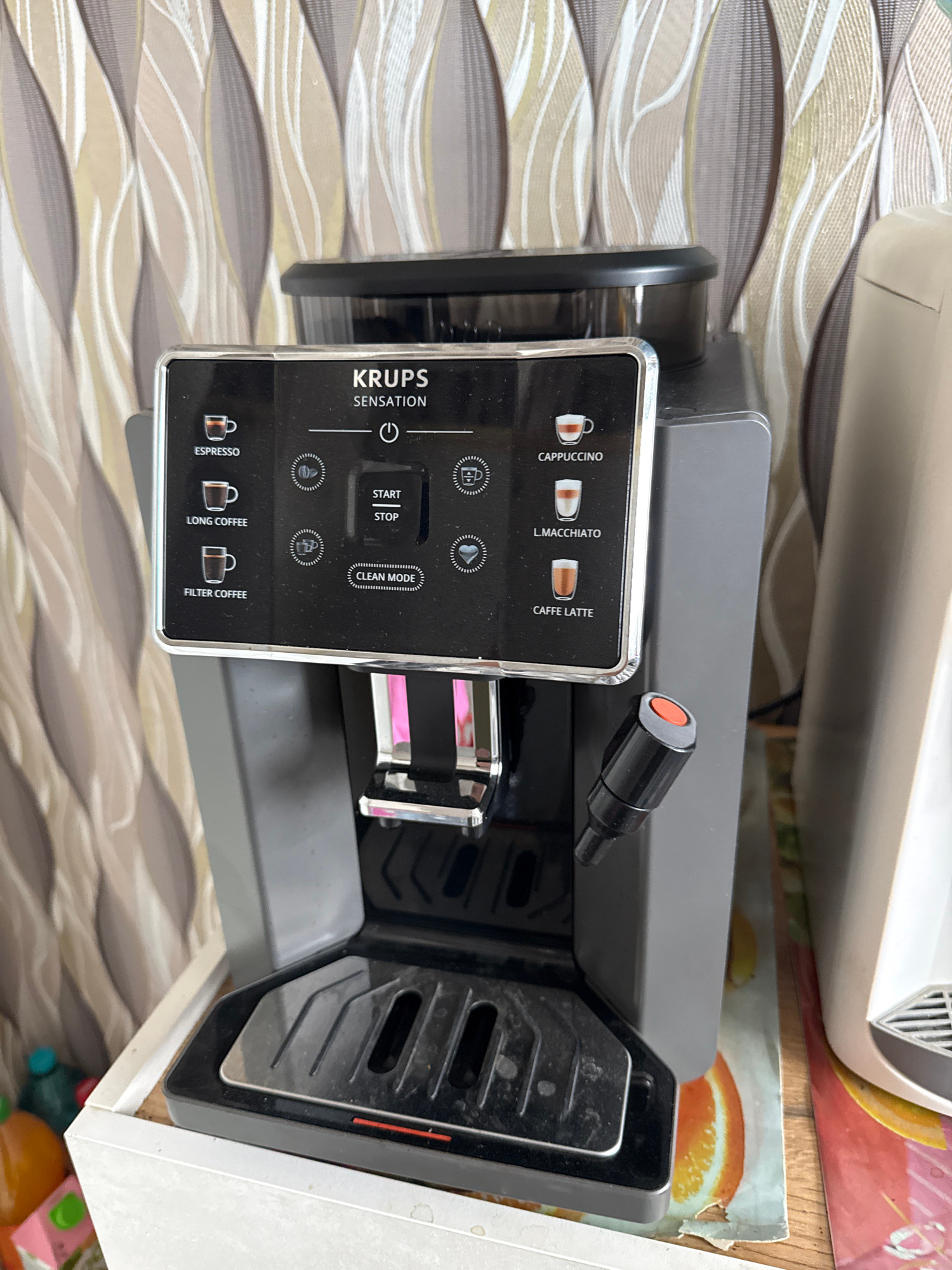 The image shows a KRUPS Sensation coffee machine in a domestic setting. The machine is gray and black with a control panel featuring options for cappuccino, latte macchiato, caffe latte, espresso, lon…read more