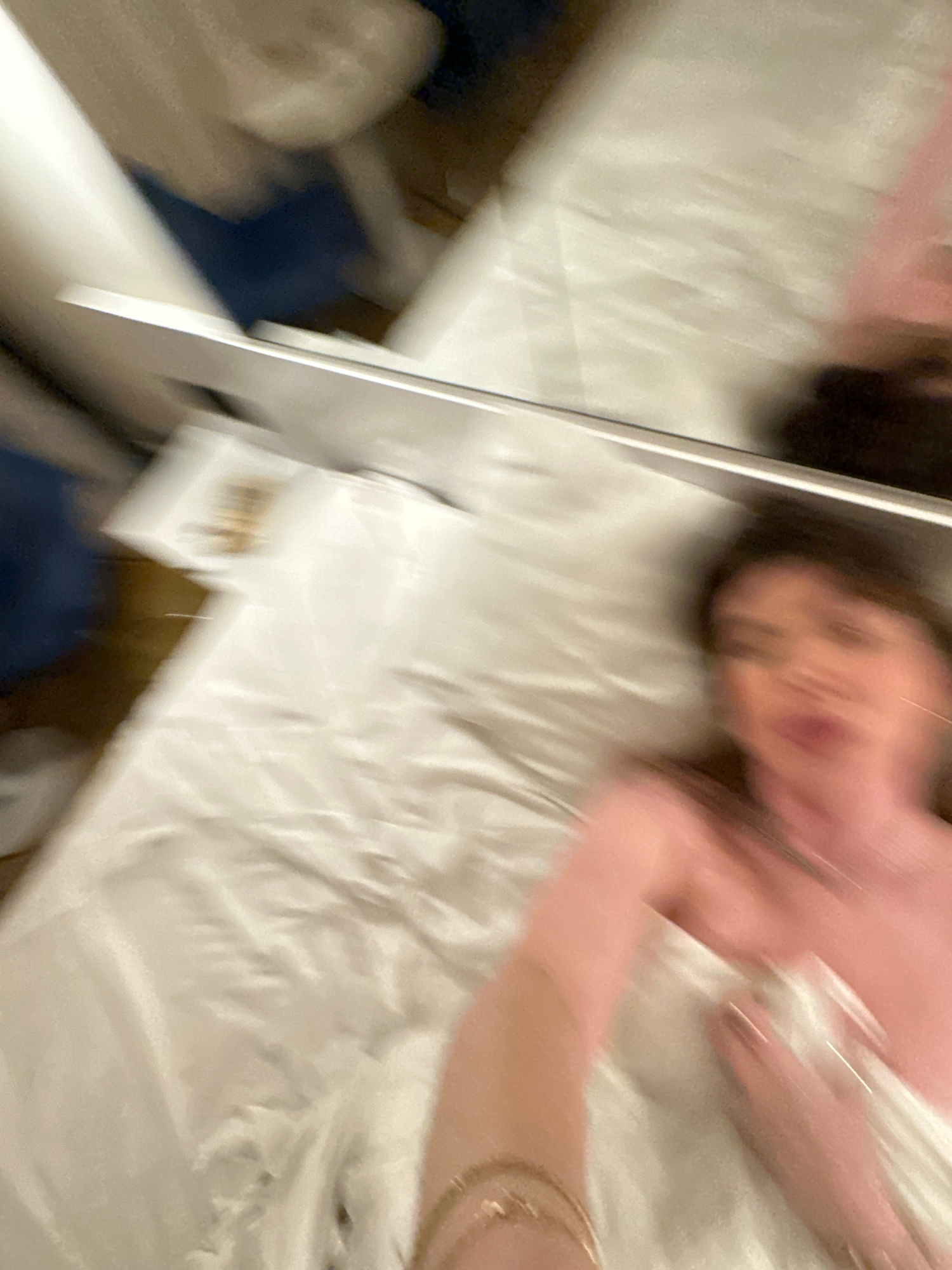 The image is blurry and appears to be taken at an unusual angle, possibly a selfie reflected in a mirror. The reflection shows a person with brown hair and what seems to be a pink top, lying on a whit…read more