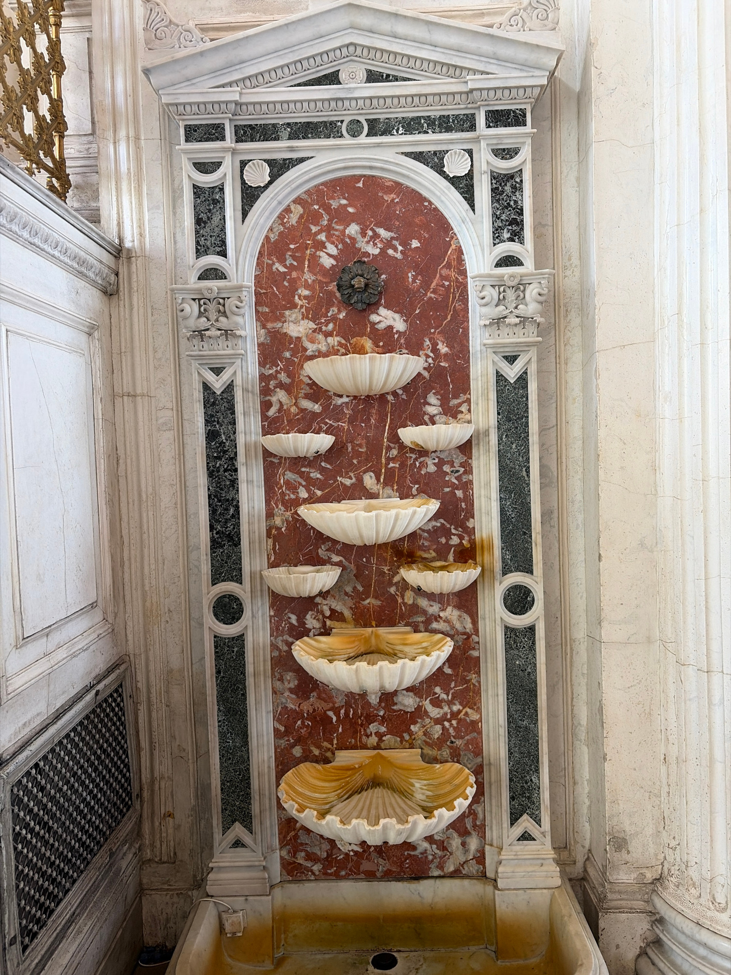 This image depicts a baptismal font in the Church of St. Catherine in Saint Petersburg, Russia. The font is decorated with multiple seashell-shaped basins arranged in a row on a marble surface with reβ¦read more